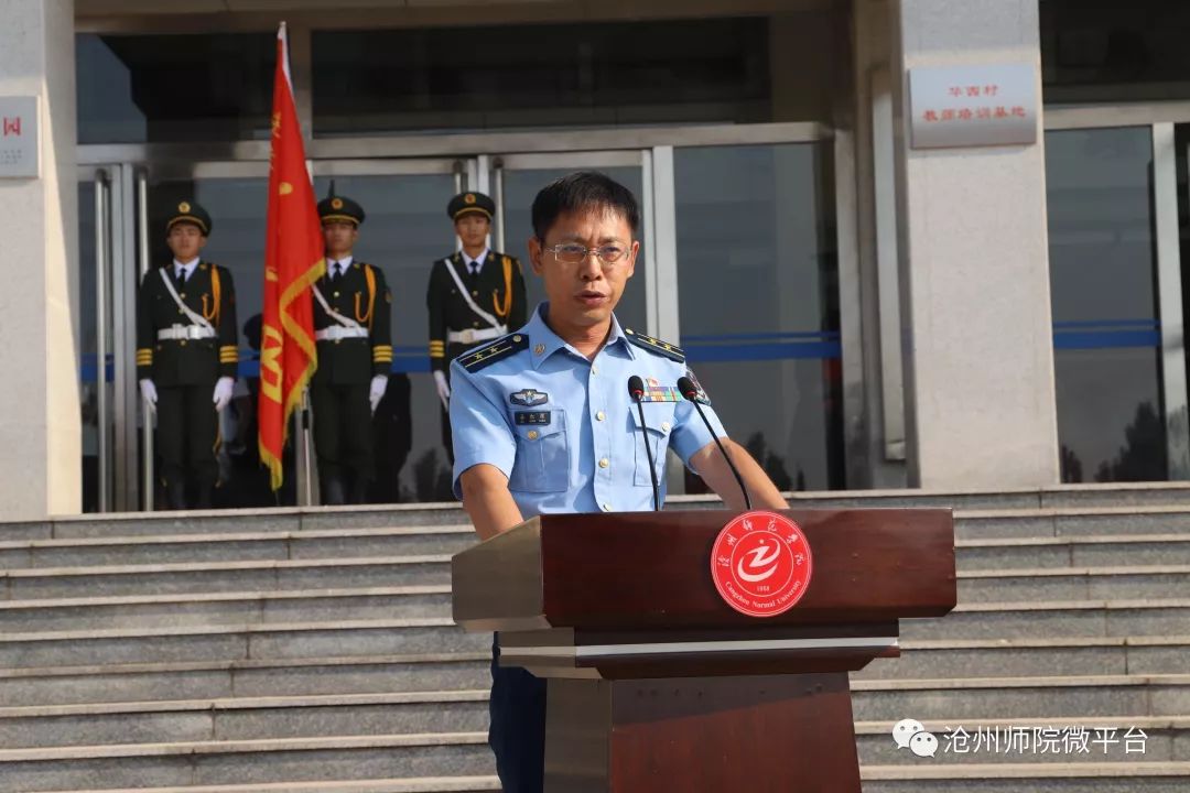 空军飞训基地沧州场站副政委谷红深代表本次军训教官发表讲话