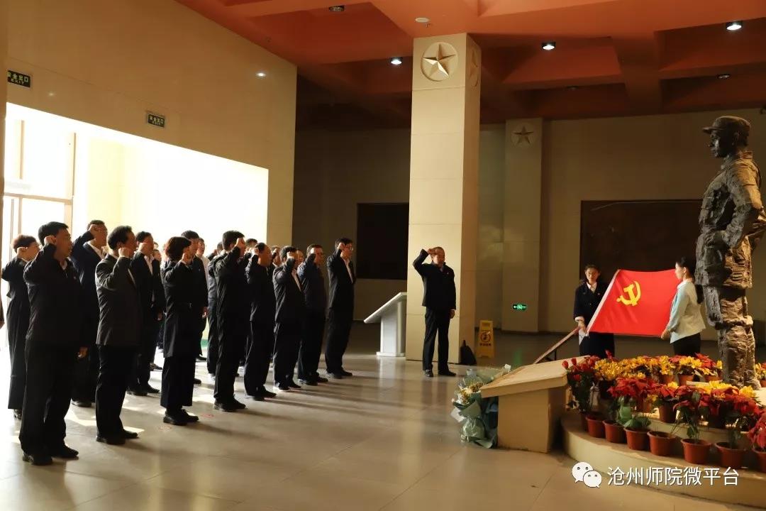 在马本斋塑像前,一行人肃立默哀,向英雄致敬。党委书记云电军,校长张占平向英雄敬献花篮。随后,在讲解员的带领下,走进纪念馆,共同回顾革命先烈艰苦卓绝的革命历程,缅怀革命先烈的丰功伟绩,接受革命传统教育。参观完毕,全体人员在序厅面对鲜艳的中国共产党党旗,在党委副书记王双库的领誓下,重温入党誓词,庄严宣誓。