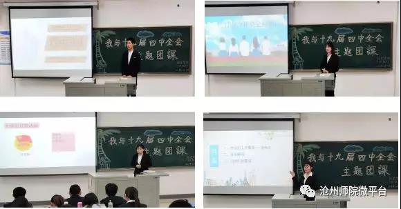 本次团课分为主题宣讲、诗歌朗诵、班级合唱三个部分。四位学生代表以“我与十九届四中全会”为主题,汇报自己学习十九届四中全会的心得体会。赵雅坤同学以十九届四中全会的“七大亮点”为切入点,分析了完善中国特色社会主义制度与推进国家治理体系与治理能力现代化的重要意义。秦桂林同学对十九届四中全会的主要内容进行了细致的梳理,并以关乎高校学子切身利益的高校奖助学金政策为例,分析了我国奖助学金资助人员的比例与规模,指出中国特色社会主义制度具有无比的优越性,坚持中国特色社会主义道路是历史的选择、现实的选择。卞增为同学分析了十九届四中全会与当代大学生的密切关系,带领大家深入学习了中国特色社会主义制度的十三个显著优势;杨得鑫同学从中华网、中国政府网等官方媒体搜集与十九届四中全会密切相关的视频与音频,并结合上述同学的宣讲内容,对会议的主要内容与精神进行了总结,认为当代大学生要自立自强,扬鞭奋蹄,担当重任,为中华民族的伟大复兴而学习、奋斗。
