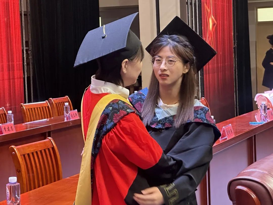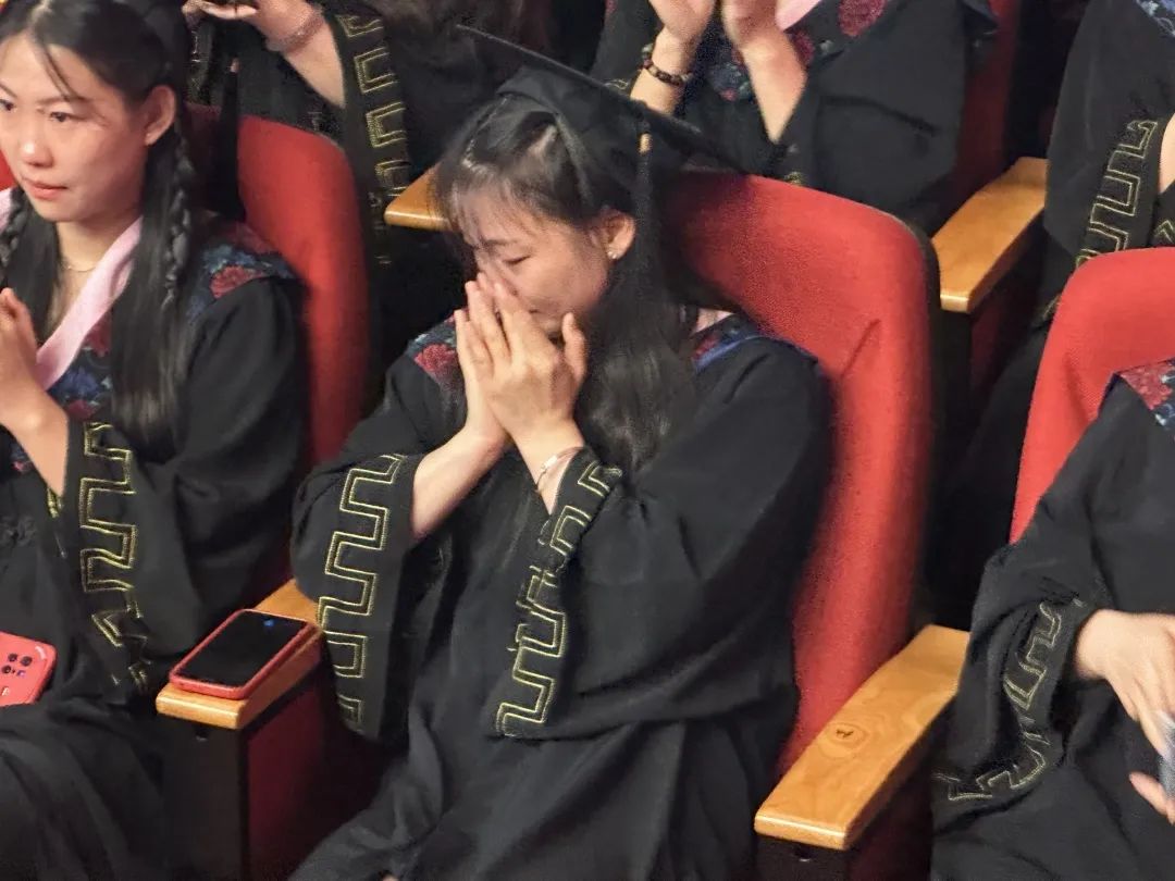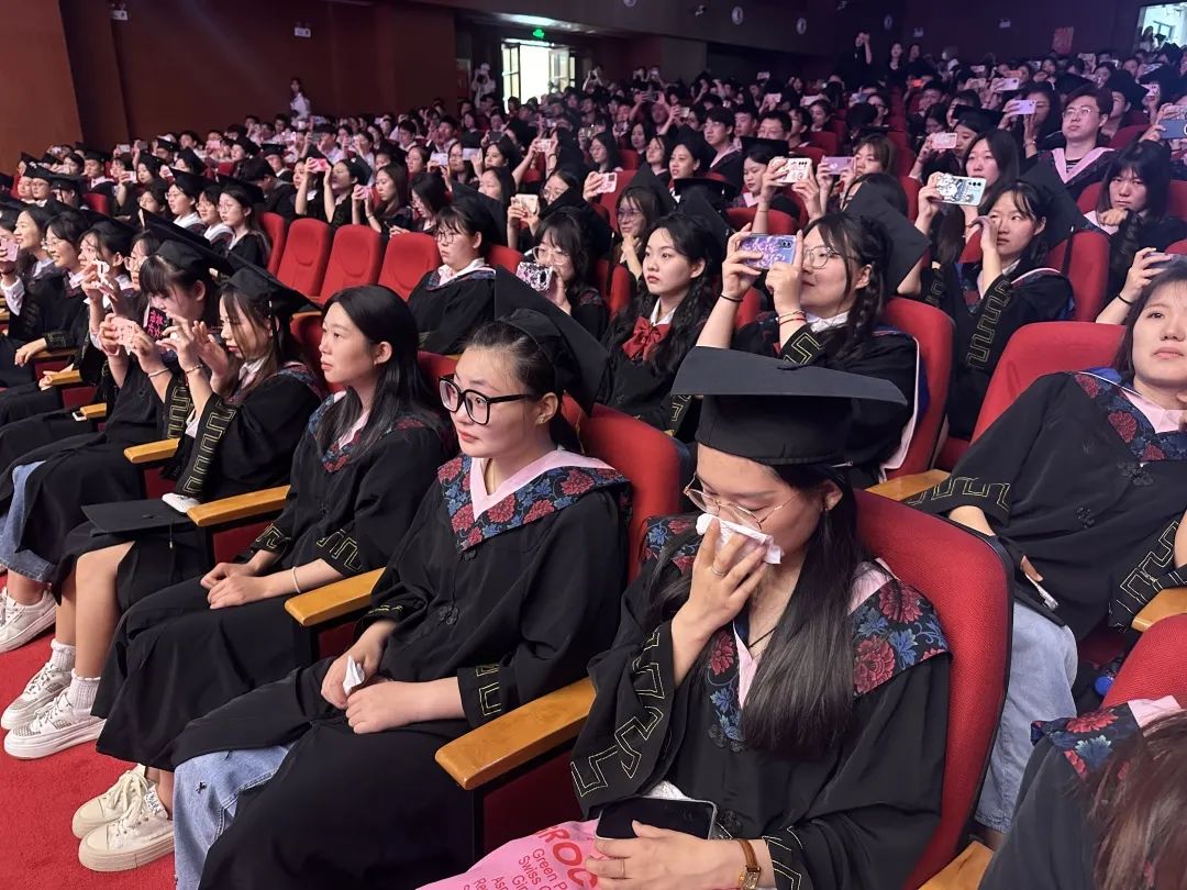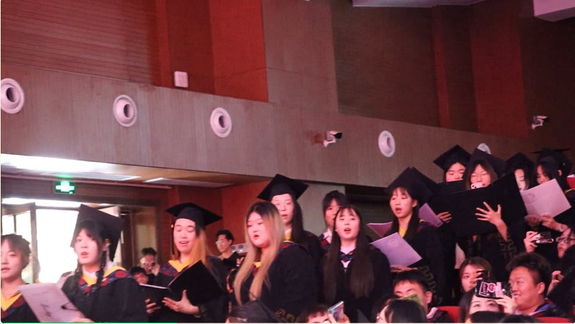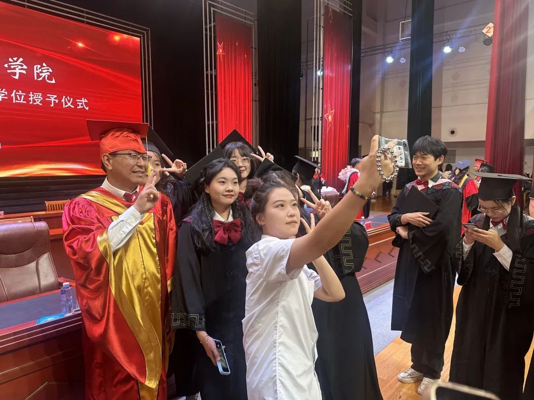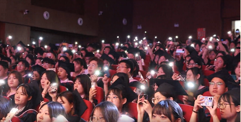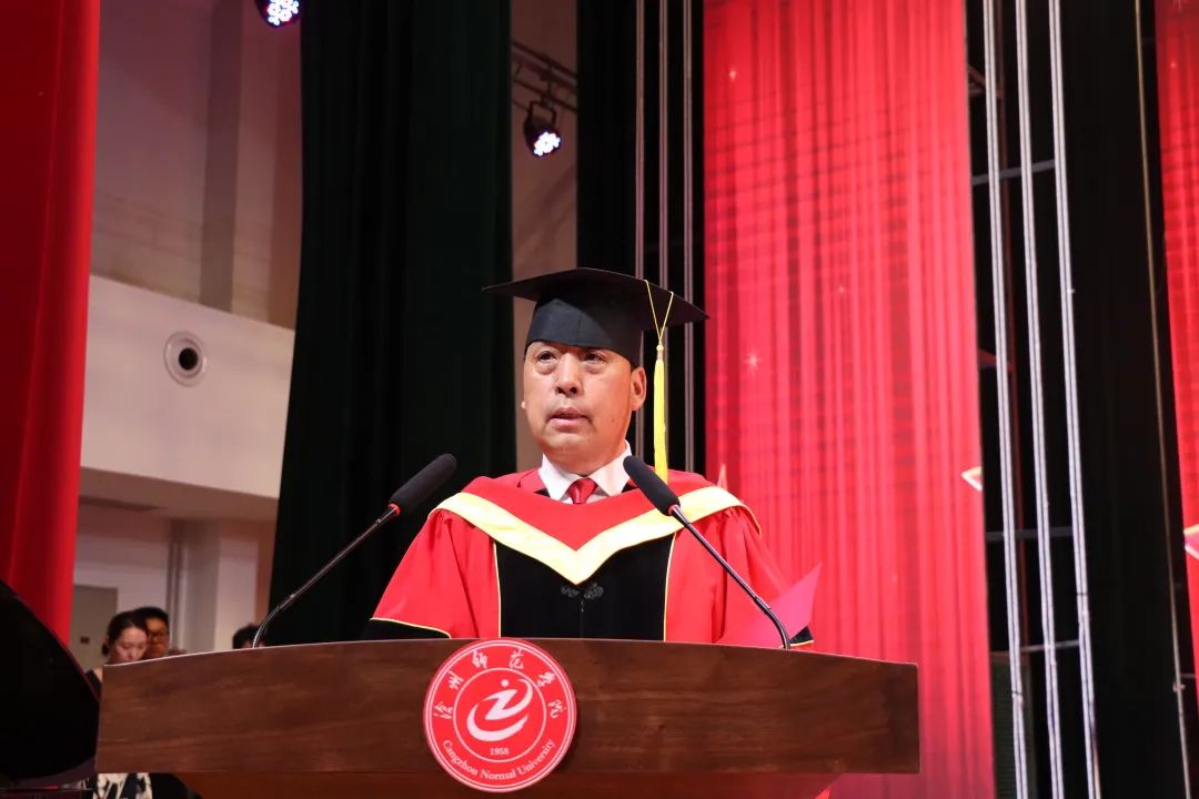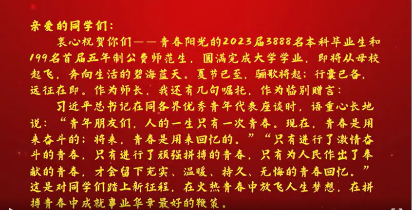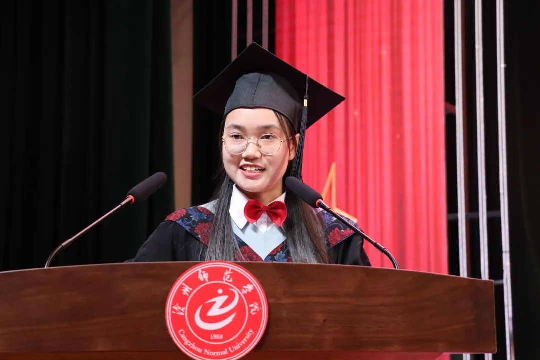 毕业生代表从慧发言,“明天,2023届的我们即将远行,我们会带着‘师院印记’,像一支支蜡烛,身杆笔直,走到哪里,就要把光亮带到哪里,让青春在不懈奋斗中,绽放绚丽之花。”