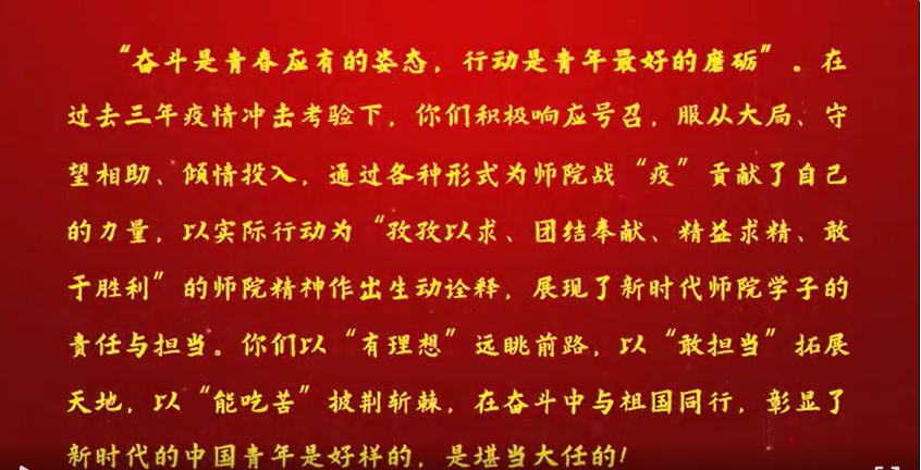 希望大家敢想敢为,唯实惟先。牢记习近平总书记的嘱托,在青春的赛道上奋力奔跑,以风雨无阻的勇气,逢山开路的担当,开拓进取的智慧,不断争取和奋斗,跑出属于你们的最好成绩,谱写属于你们这一代的“奋斗之歌”。
