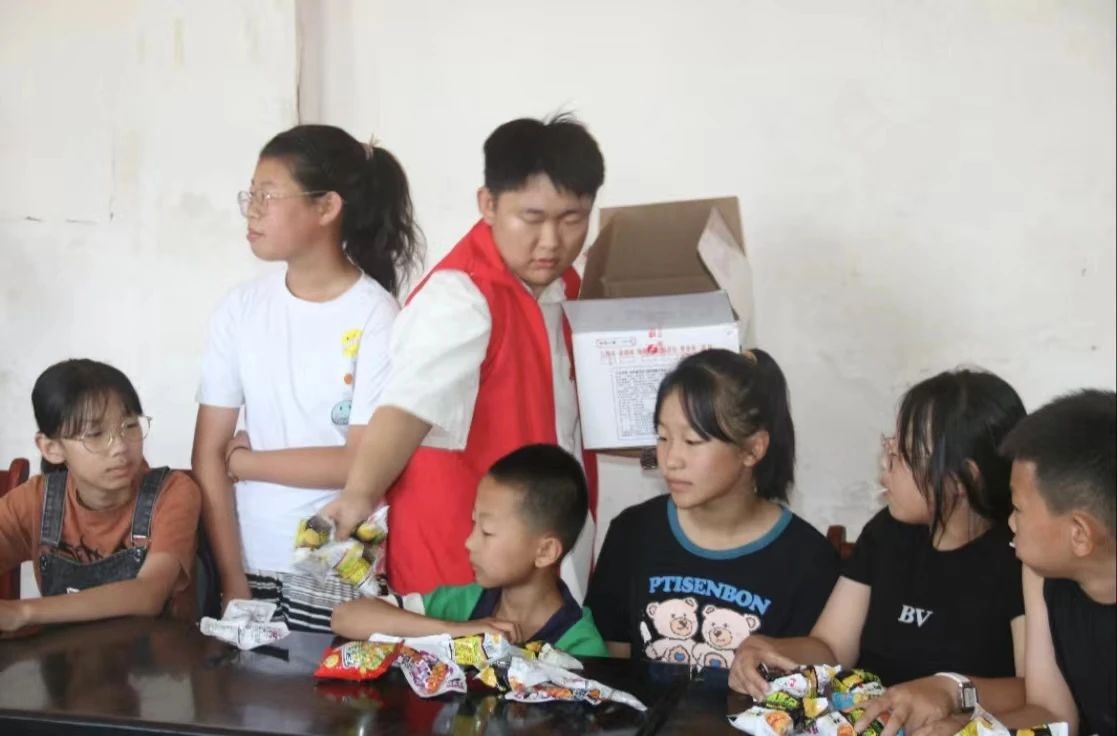 志愿者为孩子们分发零食和体育用品