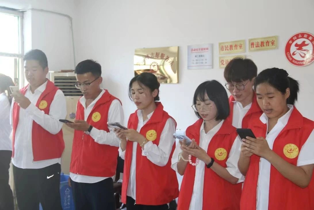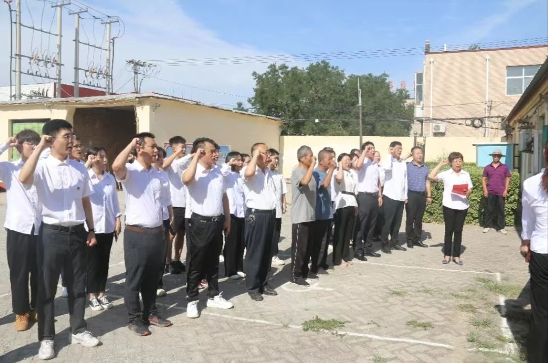 在张庄子大队会议室前,威尼斯官网志愿者和张庄子老党员面对党旗,重温入党誓词。