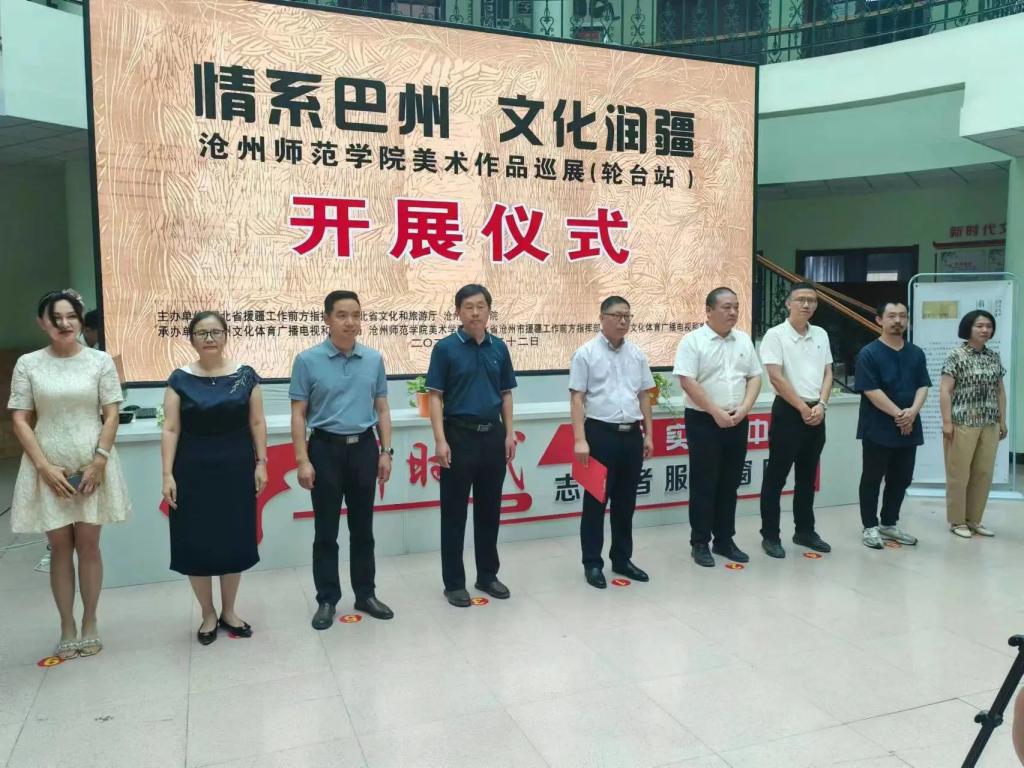 为深入贯彻落实党的二十大精神,全面贯彻落实党中央治疆方略,深化沧轮两地文化、艺术、教育交往交流交融,进一步做实做细文化润疆工作,7月22日,“情系巴州 文化润疆”美术巡展活动——8040威尼斯最佳登录美术作品巡展正式在轮台开展。轮台县委常委、副县长刘元兵,威尼斯官网党委常委、副校长周振平分别致辞。党政办公室主任刘贵振,纪委副书记谷良峰,轮台县委副书记、沧州市援疆工作前方指挥部指挥长苑博,轮台县委教育工委副书记、县教育和科学技术局党组书记、副局长巩晓霞,轮台县社科联主席李新芳出席开幕式。轮台县文旅局党组书记朱艳玲主持。