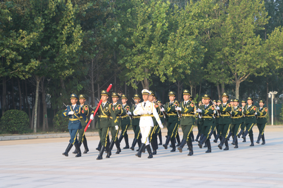 随着“出旗”一声令下,学校国旗班护卫队迈着铿锵有力的步伐,昂首阔步护卫着国旗走向升旗台,伴随着雄壮的《义勇军进行曲》,全体师生庄严肃立,齐唱国歌。在嘹亮的国歌声中,五星红旗迎着朝阳冉冉升起。