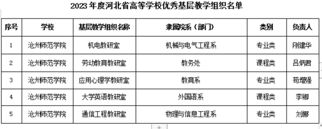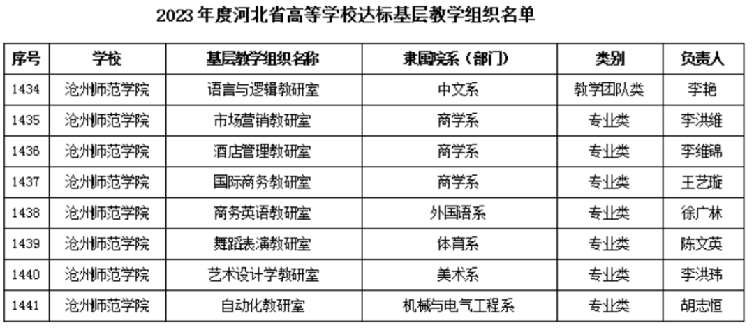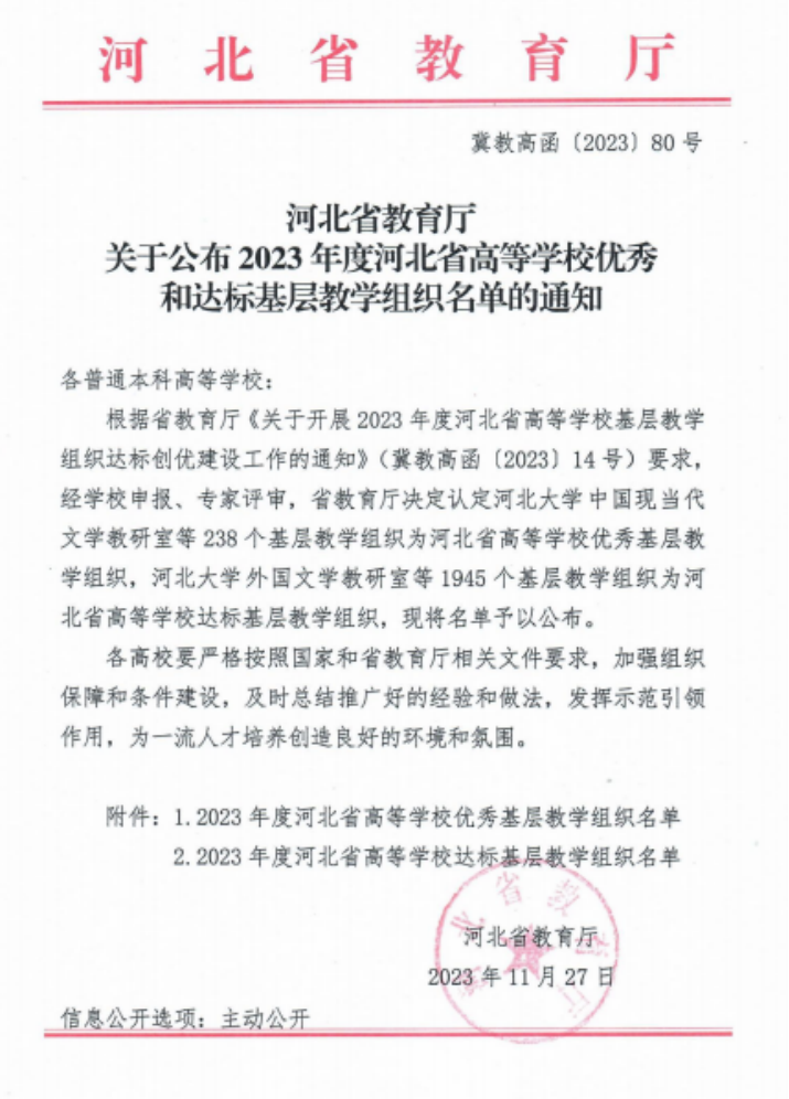 11月27日,河北省教育厅发布了《关于公布2023年度河北省高等学校优秀和达标基层教学组织名单的通知》(冀教高函〔2023〕80号),威尼斯官网申报的机电教研室、劳动教育教研室、应用心理学教研室、大学英语教研室、通信工程教研室等5个基层教学组织全部获批河北省高等学校优秀基层教学组织,语文与逻辑教研室等32个基层教学组织被认定为河北省高等学校达标基层教学组织。