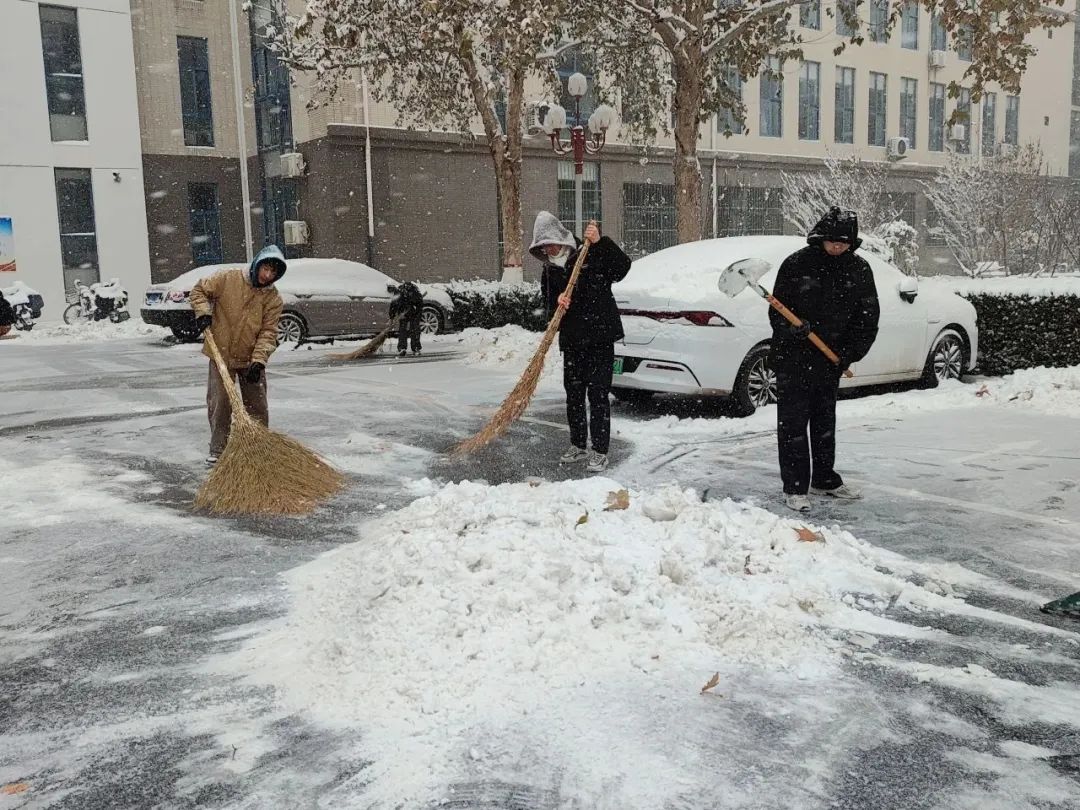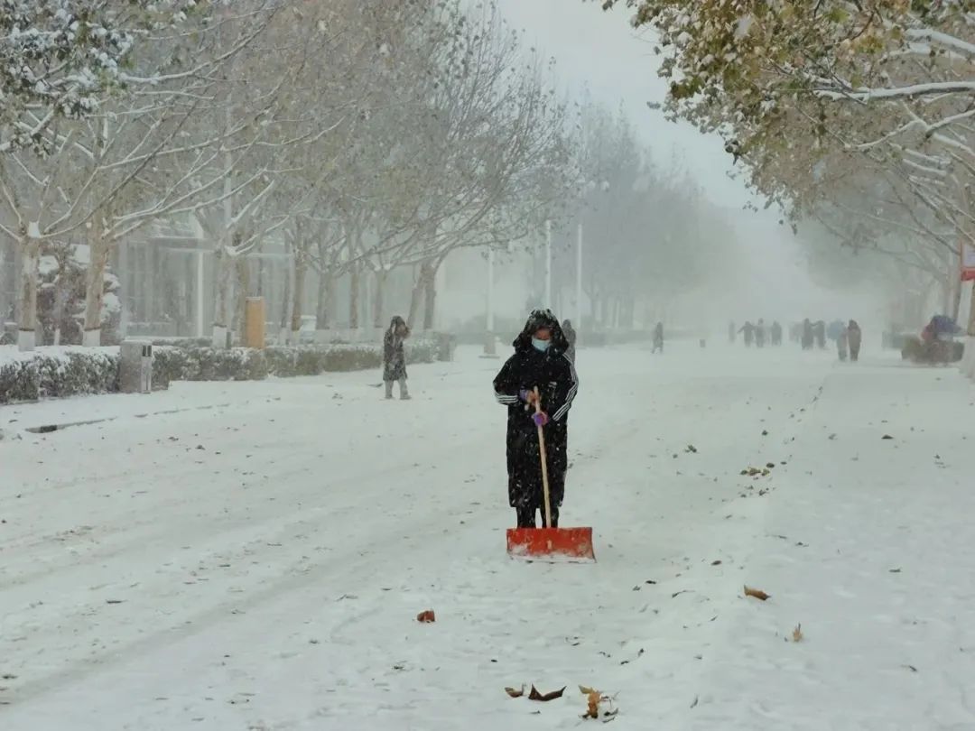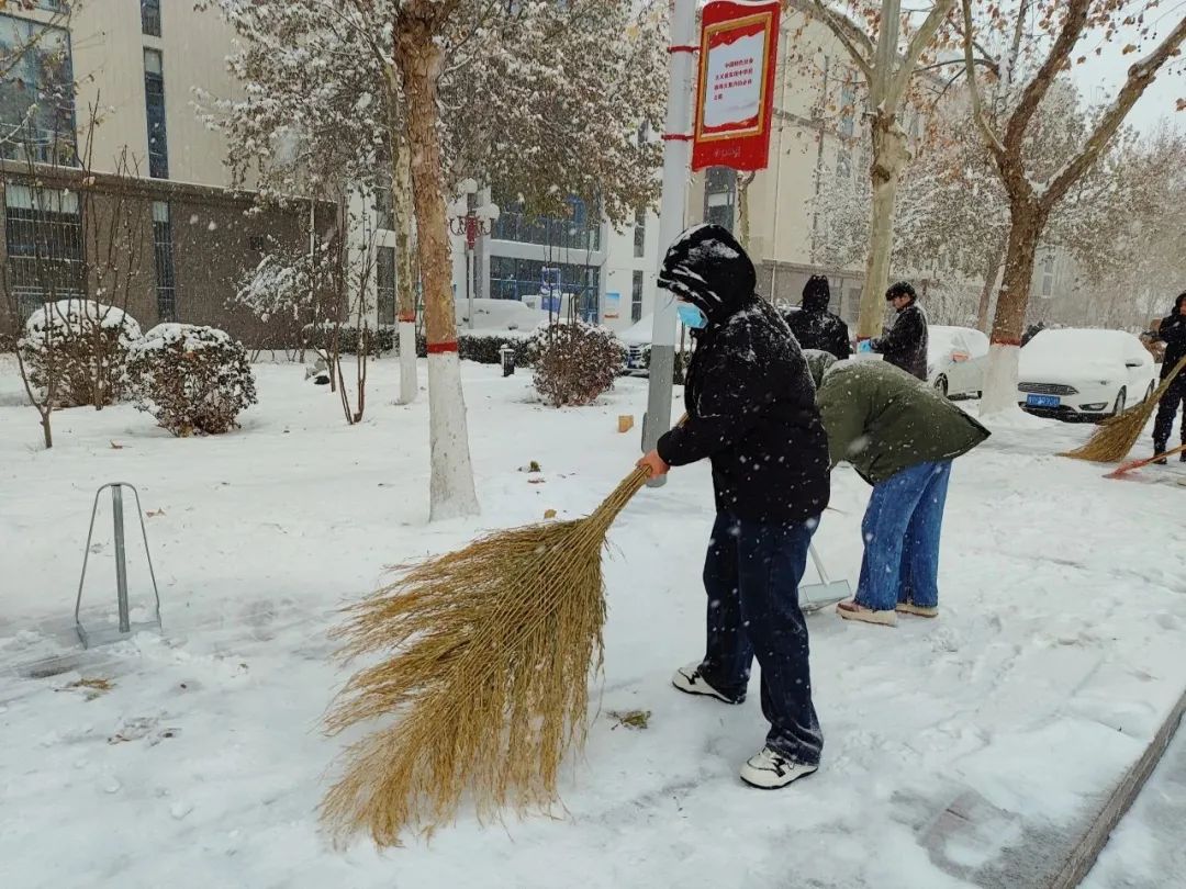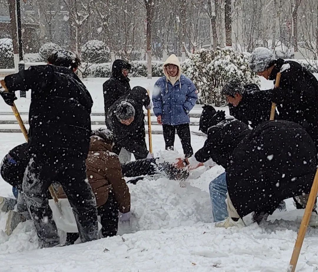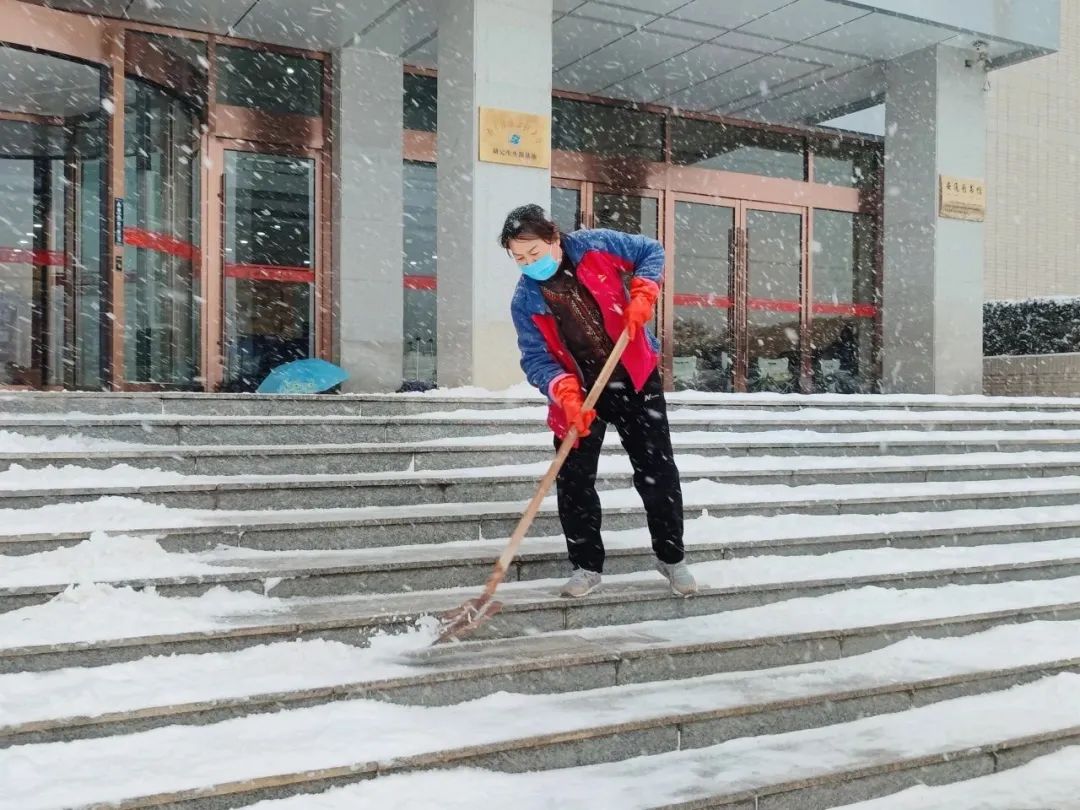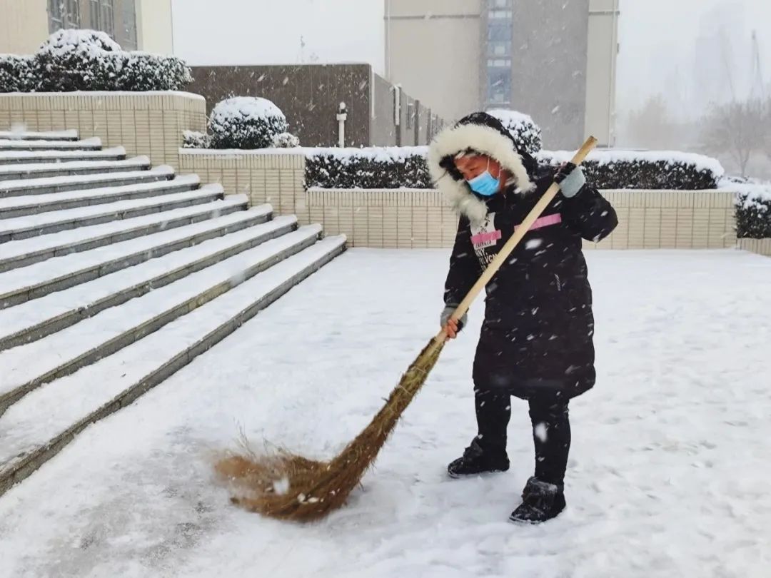 在漫天飞雪中,校园里坚守岗位的教职工,不畏严寒,保证教学和管理服务工作的正常运行。雪后初霁,师生在第一时间拿起工具,清扫积雪。这些认真的模样,比雪人还美。