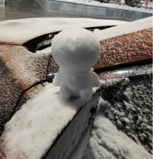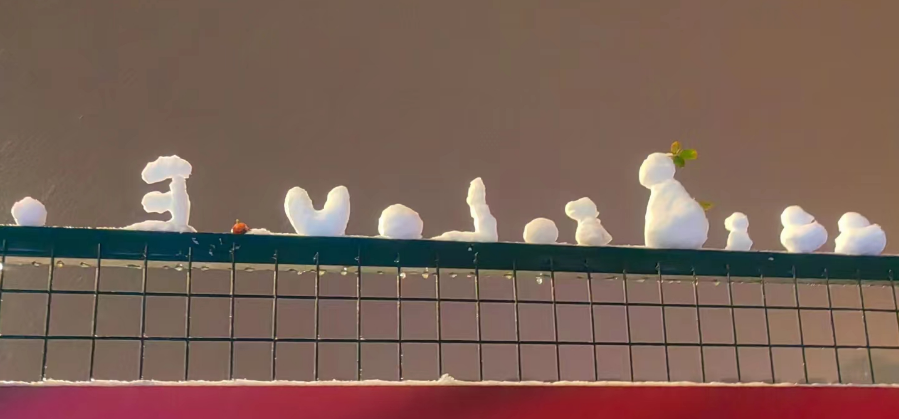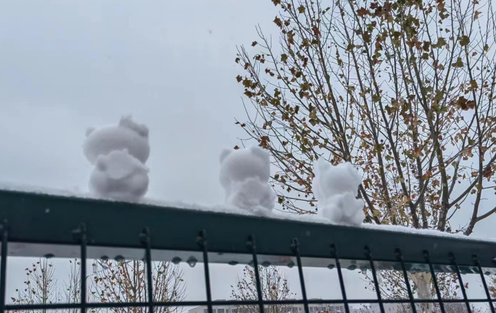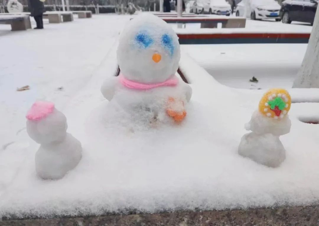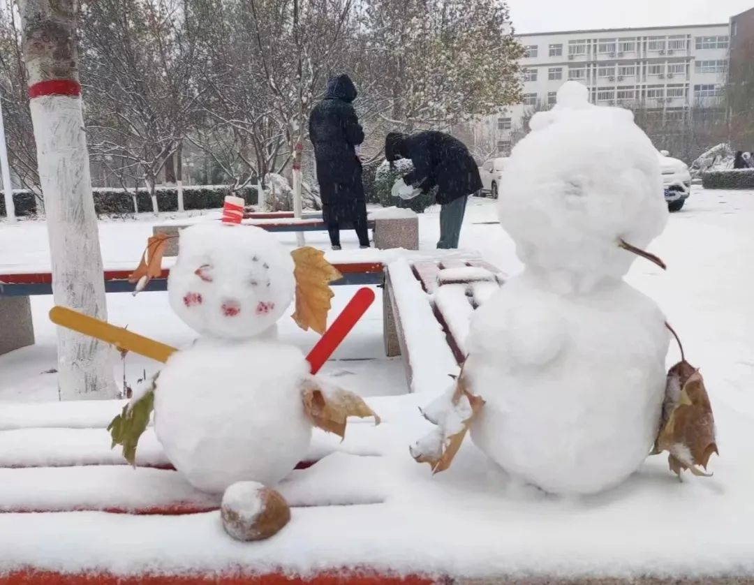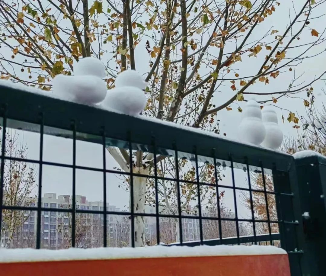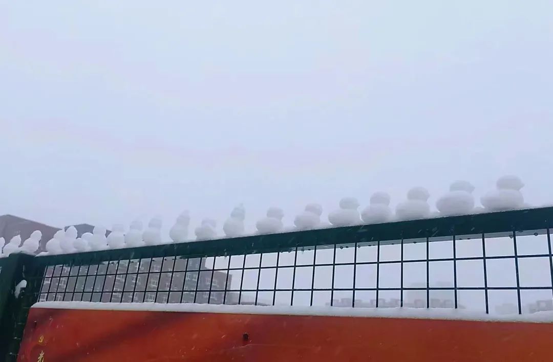 长椅上,操场围栏上,树杈里,教职工车辆的后视镜上以及温暖的手心里……小雪人儿无处不在。