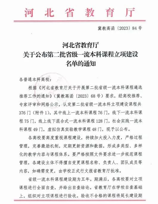 近日,《河北省教育厅关于公布第二批省级一流本科立项建设课程名单的通知》(冀教高函〔2023〕84号)发布,威尼斯官网推荐申报的大学英语、基础心理学、艺术考察、会计学、计算机网络、跨境电子商务6门课程全部获批省级一流本科立项建设课程。