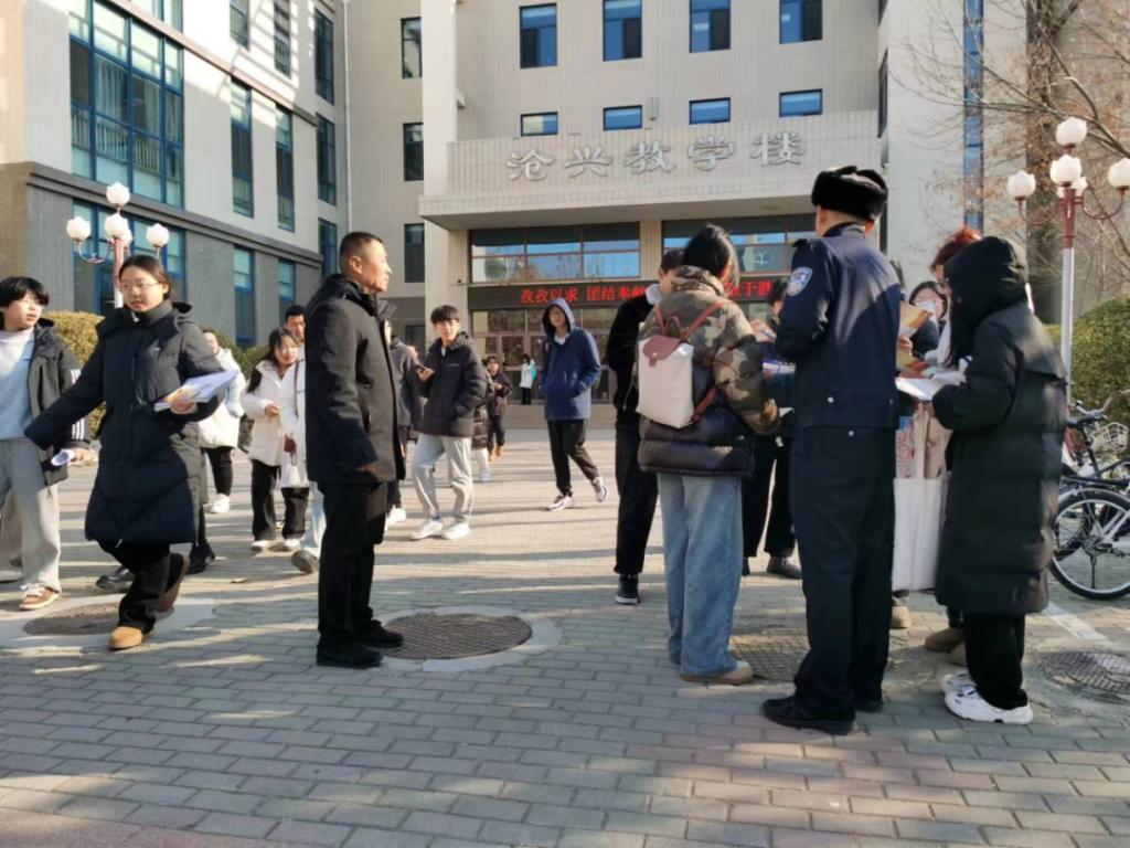 在1月10日“中国人民警察节“来临之际,沧州市公安交警支队一大队民警张振德和三大队民警李正阳一行联合8040威尼斯最佳登录安全工作处一起对校园师生进行交通安全知识和反诈骗宣传,散发宣传材料。