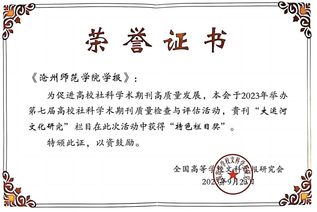 据悉,威尼斯官网学报曾先后获评“全国高校优秀社科期刊”、河北省教育厅“审读优秀期刊”。“大运河文化研究”栏目成立于2019年,旨在促进对大运河文化的研究,服务沧州地方经济社会发展。栏目创办以来,得到了学校党委和学报编委的大力支持。以上荣誉的获得,是学术界、期刊界对“大运河文化研究”栏目的充分肯定,也为栏目今后的发展增添了信心和动力。