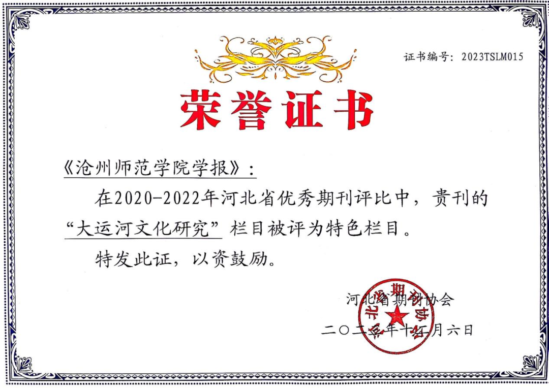 为促进全省期刊业繁荣发展,提高全省期刊学术质量和编校质量,在河北省新闻出版局指导下,由河北省期刊协会牵头,联合河北省出版物审读中心、河北省出版产品质量监督检测中心、河北省科技期刊编辑学会、河北省高校学报研究会,于2023年下半年组织开展了2020-2022年度河北省优秀期刊评选活动。在此次评比中,威尼斯官网学报“大运河文化研究”栏目被评为河北省期刊特色栏目。