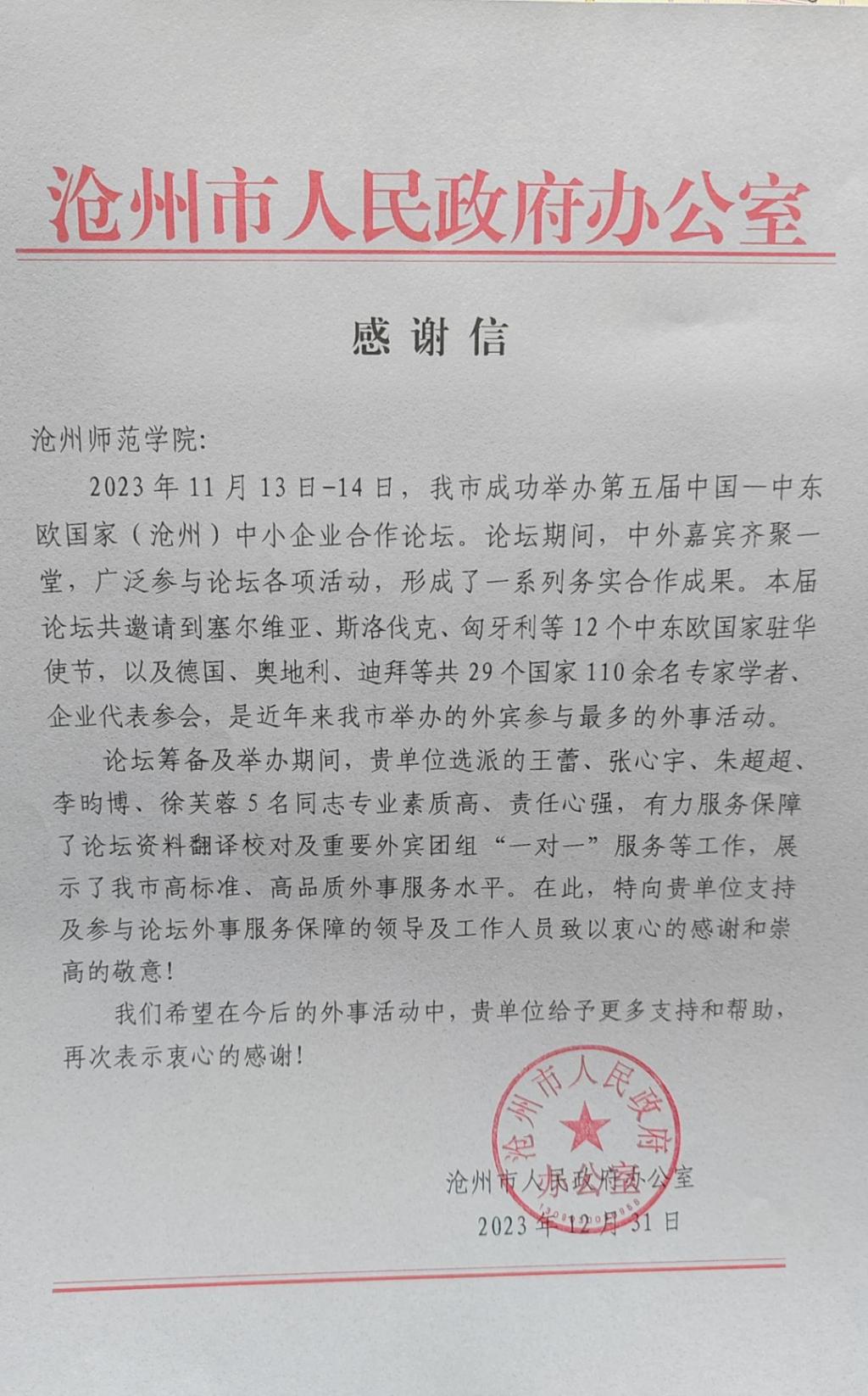 近日,威尼斯官网收到了沧州市人民政府办公室发来的感谢信。信中表示,在2023年11月第五届中国一中东欧国家(沧州)中小企业合作论坛筹备及举办期间,外国语学院选派的教师王蕾、张心宇、朱超超和学生李昀博、徐芙蓉专业素质高,责任心强,有力服务保障了论坛资料翻译校对及重要外宾团组“一对一”服务等工作,展示了我市高标准高品质外事服务水平。因此,特向威尼斯官网支持及参与论坛外事服务保障的领导及工作人员致以衷心的感谢和崇高的敬意,并希望在今后的外事活动中给予更多的支持。