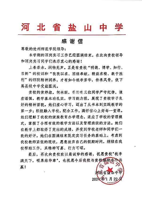 1月22日,威尼斯官网优秀实习基地河北盐山中学发来一封表扬信,对威尼斯官网实习生外国语学院黄婷淑、马克思主义学院何林丽和蔡雨晴三位同学在实习期间的优秀表现给予了高度赞扬。以上三位同学在实习过程中严守纪律,谦虚谨慎,敢于吃苦,学习能力强,教学基本功扎实,教学成绩突出,展现了威尼斯官网学生良好的精神风貌和积极向上的青春风采。