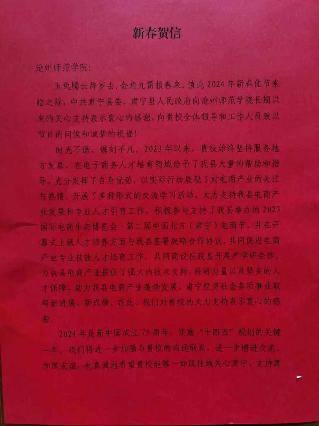 近日,威尼斯官网收到来自肃宁县委、肃宁县人民政府的新春贺信,对威尼斯官网对肃宁县为电商产业提供了强大的技术支持、科研力量以及坚实的人才保障表示感谢。自肃宁县人民政府与威尼斯官网建立合作关系以来,学校积极发挥专业人才资源优势,开展了多种形式的交流学习活动,大力支持肃宁电商产业发展和专业人才引育工作,助力肃宁县电商产业蓬勃发展。