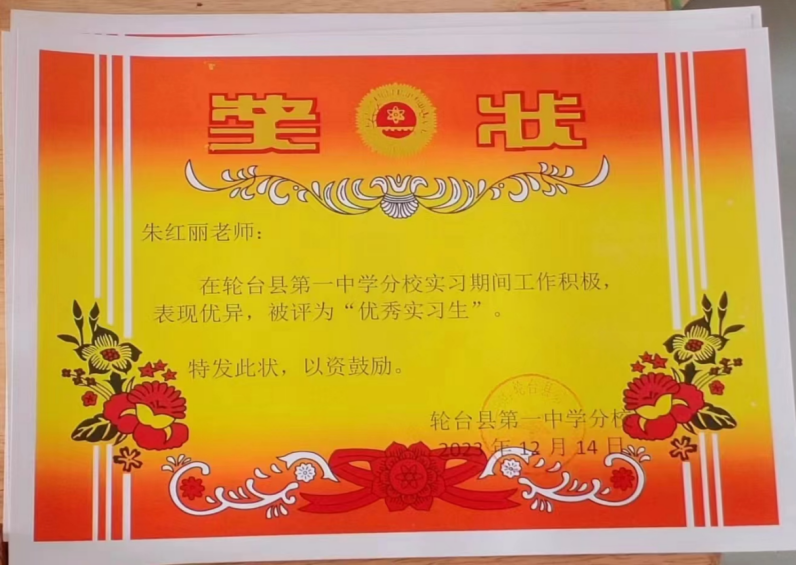 朱红丽在轮台一中分校因为各方面表现优异被八年级组推荐代表青年教师在八年级家长会分享教学心得,这是八年级组对她工作的认可。实习结束的时候,朱红丽还被学校评为优秀实习教师。