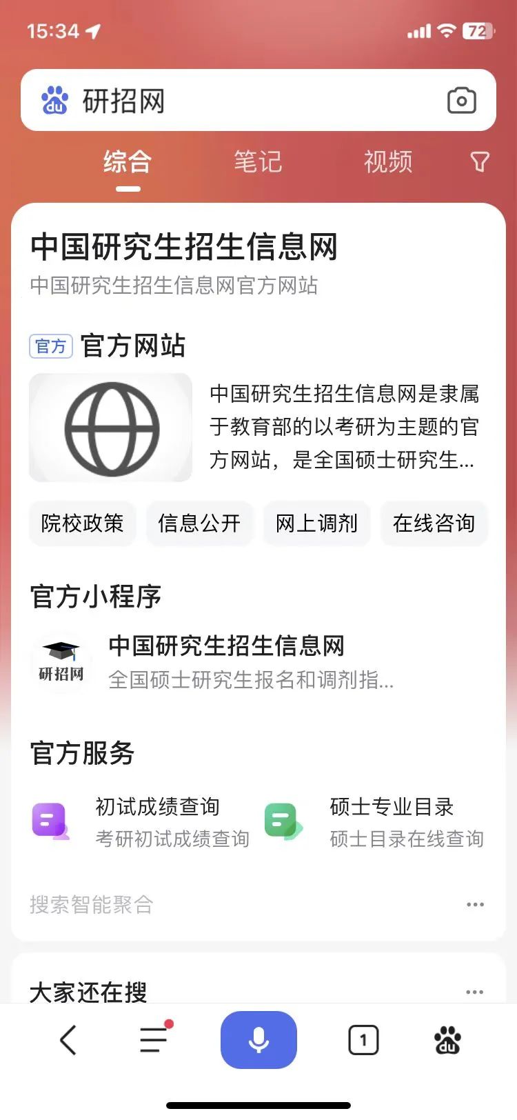 打开“百度”APP输入“研招网”,进入中国研究生招生信息网官方小程序,点击“初试成绩查询”,点击“立即查询”,按照页面提示输入对应的姓名和证件号码进行查询。