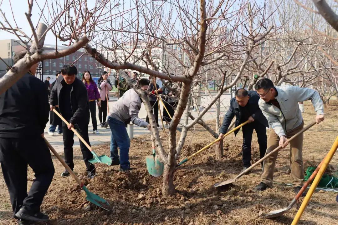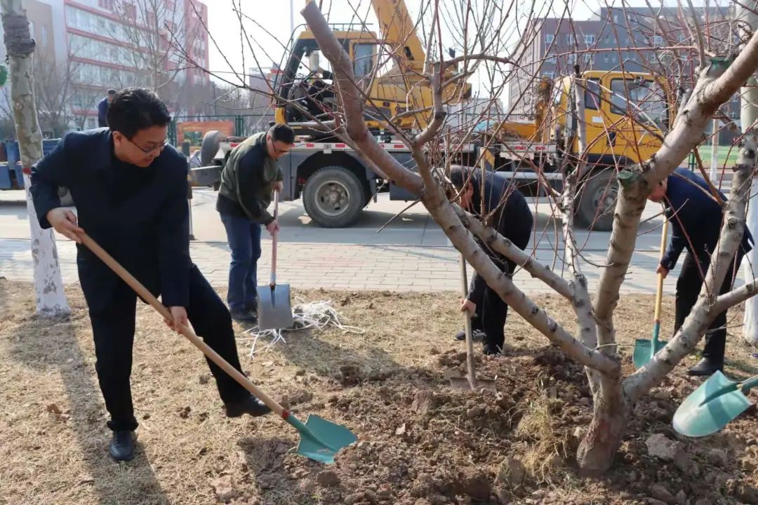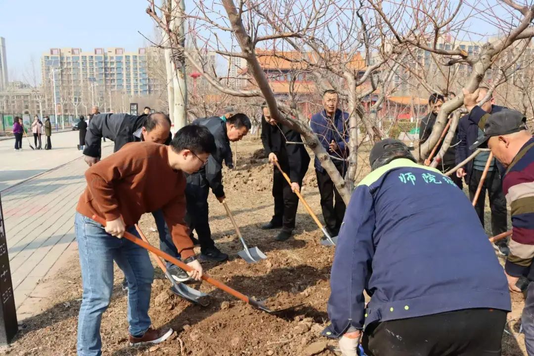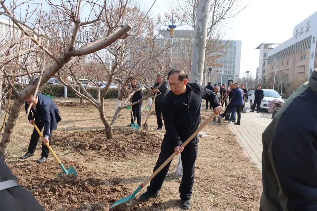植树现场,干部教师精神饱满,分组行动,共同挥锹扬锄,挖坎植苗,培土浇水。随着干部教师们的劳动,一棵棵新栽的树苗稳稳地扎进土中,为初春的师院增添了一抹绿色。