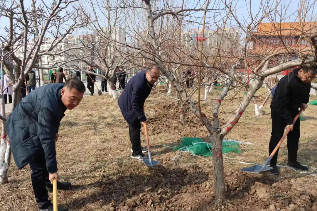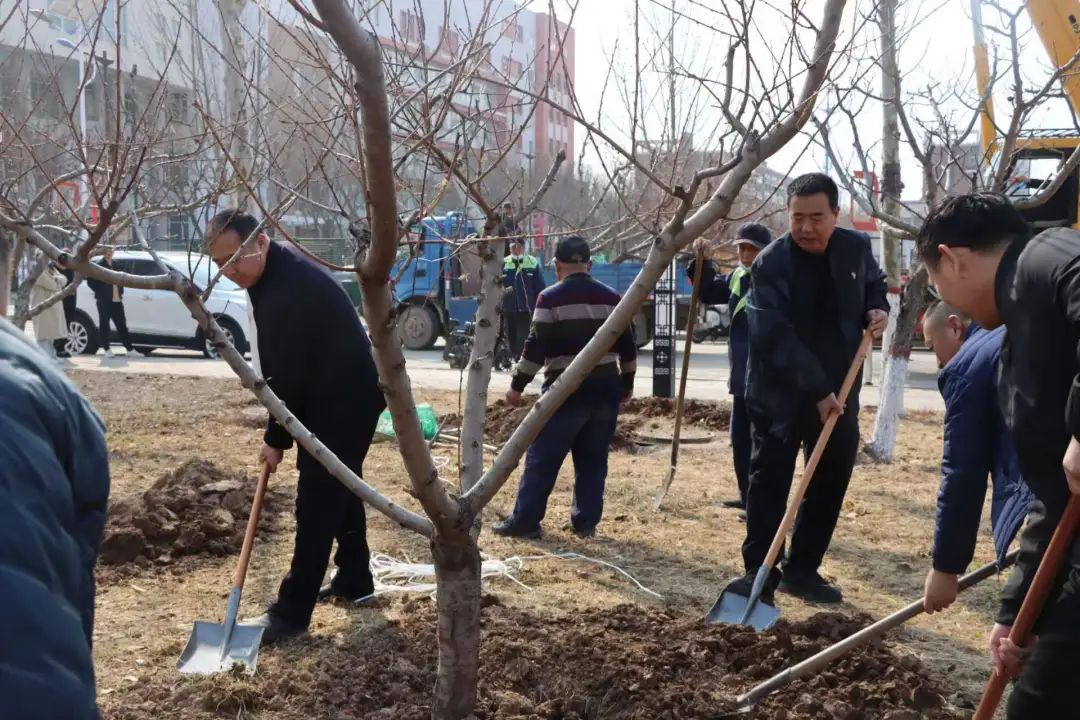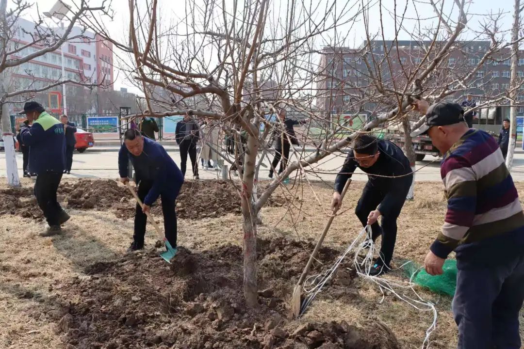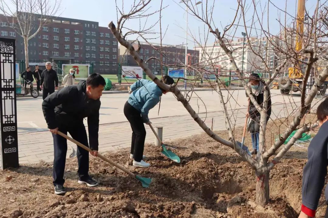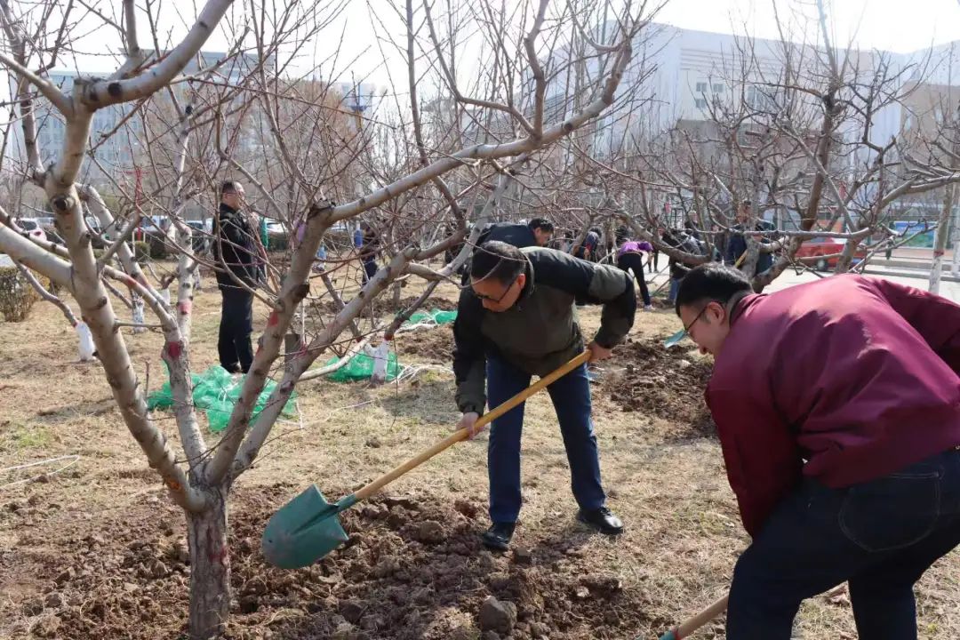 植树现场,干部教师精神饱满,分组行动,共同挥锹扬锄,挖坎植苗,培土浇水。随着干部教师们的劳动,一棵棵新栽的树苗稳稳地扎进土中,为初春的师院增添了一抹绿色。