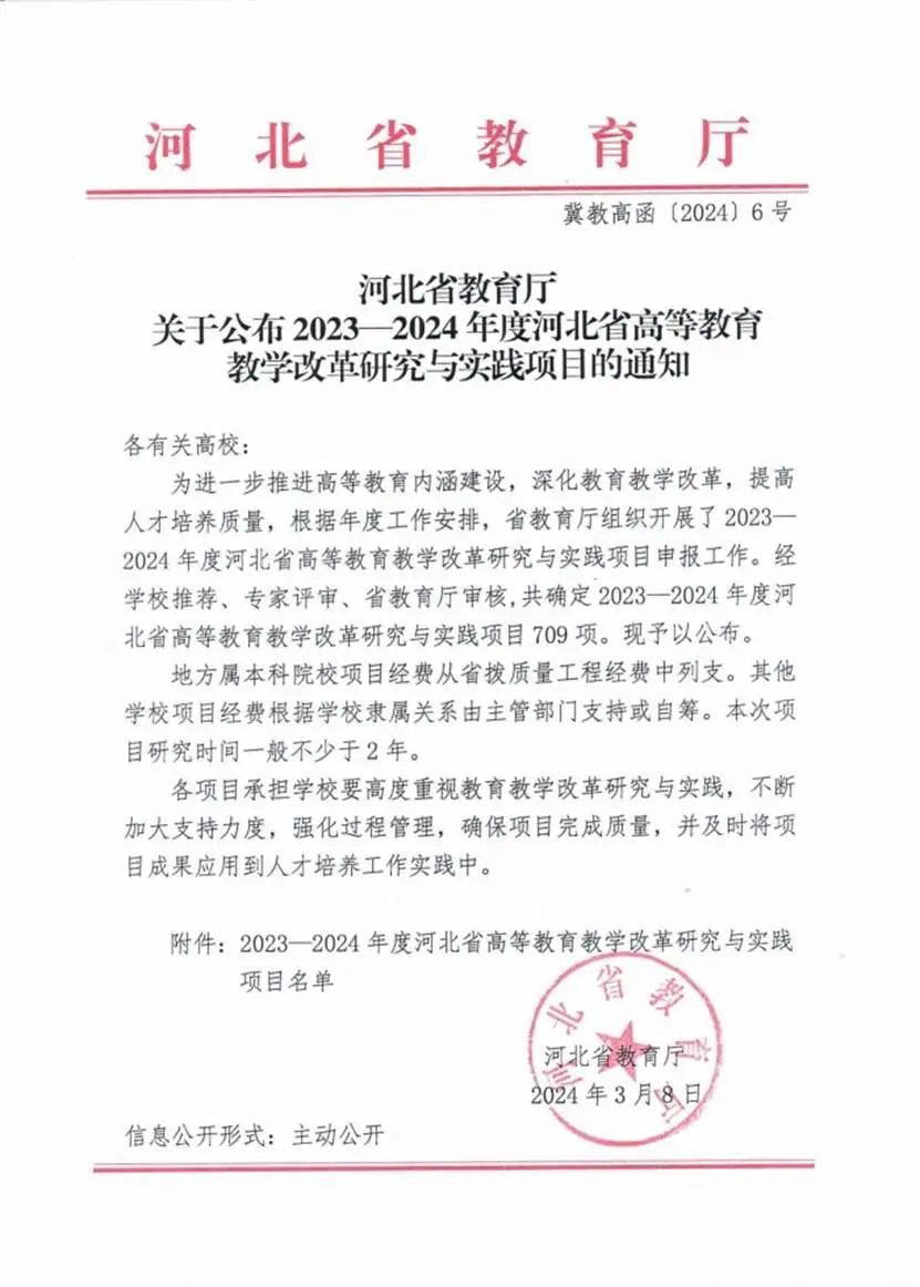 近日,河北省教育厅发布了《河北省教育厅关于公布2023-2024年度河北省高等教育教学改革研究与实践项目的通知》(冀教高函〔2024〕6号),威尼斯官网推荐的10项教育教学改革研究与实践项目经过专家评审和教育厅审核,成功获得立项。