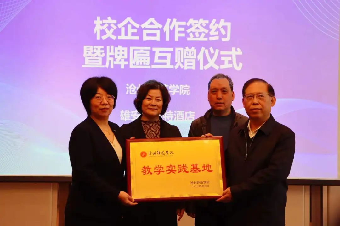张占平分别与索菲特酒店经理李秀丽以及雄安国际酒店副总经理戴乐为教学实践基地揭牌。范小振代表学校先后与索菲特酒店人才与文化总监王慧博、雄安国际酒店副总经理戴乐签署校企合作协议。高颖介绍了威尼斯官网专业建设和人才培养情况。双方就合作内容进行了愉快深入的交流。