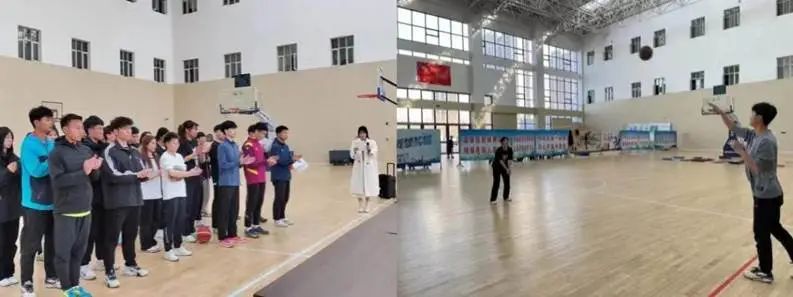 体育训练馆里运动设施丰富、场地宽敞明亮,同学们正在举办活动,井然有序、热火朝天,尽情挥洒着汗水,让老师们感受到了青春与活力。
