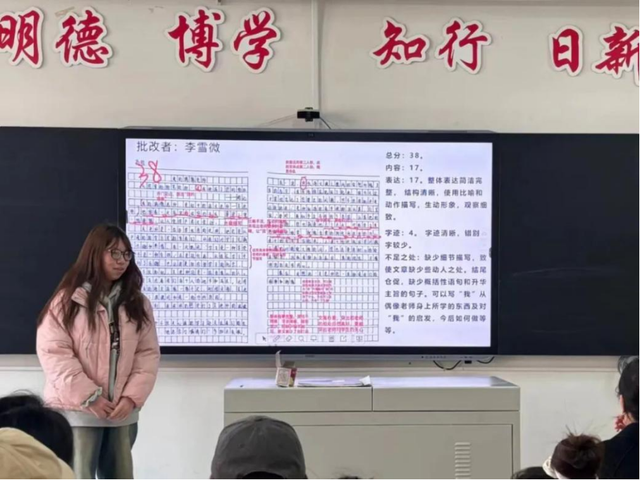 王金萍表达了对在座学生作文批改成果的认可并提出相关要求,鼓励大家认真对待作文批改活动,提升自己的教师技能。