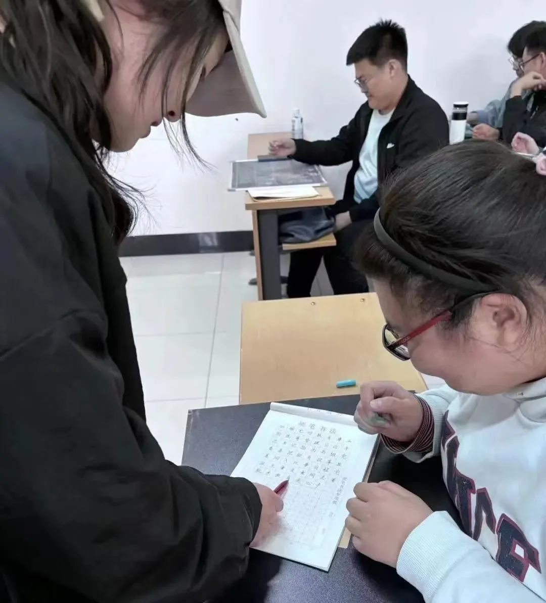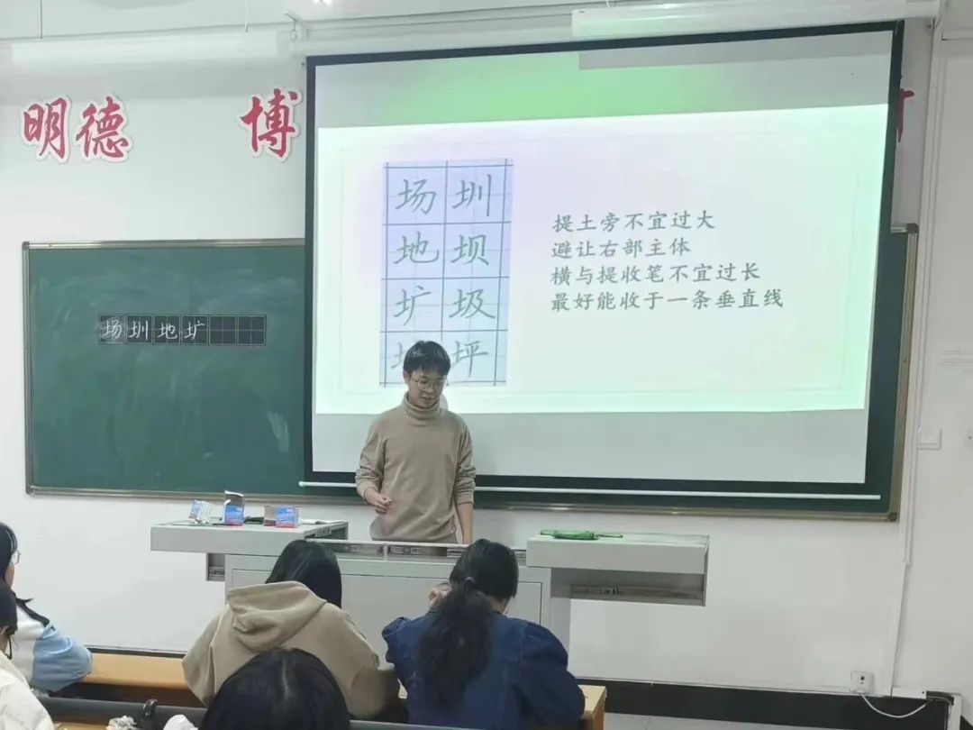 文学院充分利用书法学专业优势,选取书法学优秀学生代表,并组织汉语言文学专业高年级两笔字获奖的同学,面向2023级师范生进行两笔字书写指导。在硬笔字授课活动中,每班各配备一名同学作为“小先生”,“小先生”每周对负责班级的硬笔字进行批阅和硬笔字指导,同时协助同学们修改不规范的硬笔字。