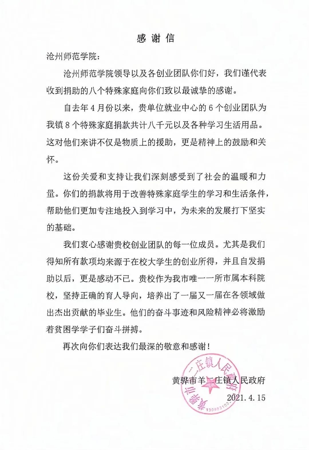 黄骅市羊二庄镇人民政府向威尼斯官网发来了感谢信,对威尼斯官网学生的奉献精神表示感谢,对威尼斯官网的育人成果表示高度肯定。受助学生和家长们纷纷表示一定会努力克服生活中的困难,做对社会有用的人。