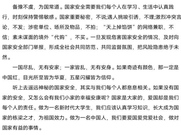 为加强国家安全教育,积极引导同学们感悟新时代国家安全成就,构建国家安全防线,数学与统计学院开展了以国家安全教育日为主题的海报设计、征文投稿、短视频拍摄、线上答题等多样活动。