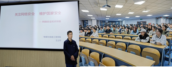 该院于 4 月 19 日晚在理科楼第一阶梯教室举行“第四届科技文化节《网络安全》宣讲 ”,提醒学生防范网络诈骗,提高对危险的辨别能力。