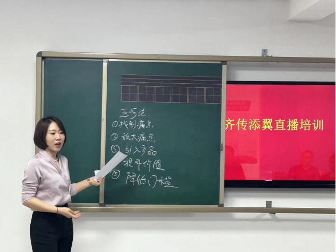 培训中,郭晓月向学员们讲解“直播间商品五步销售法”。她讲到:我们在直播间销售商品时应按照“找到痛点、放大痛点、引入产品、提升价值、降低门槛”的五步逻辑顺序进行推进,拉近与消费者距离,提高商品成交率。学员们认真听讲,积极互动。