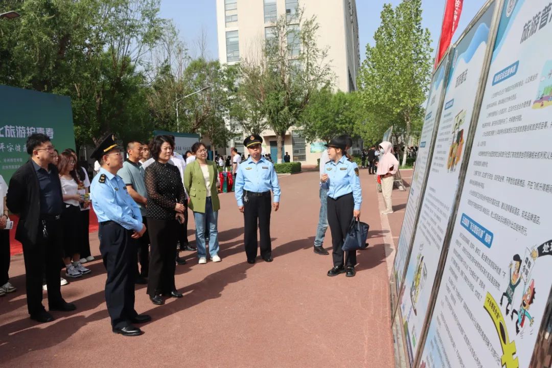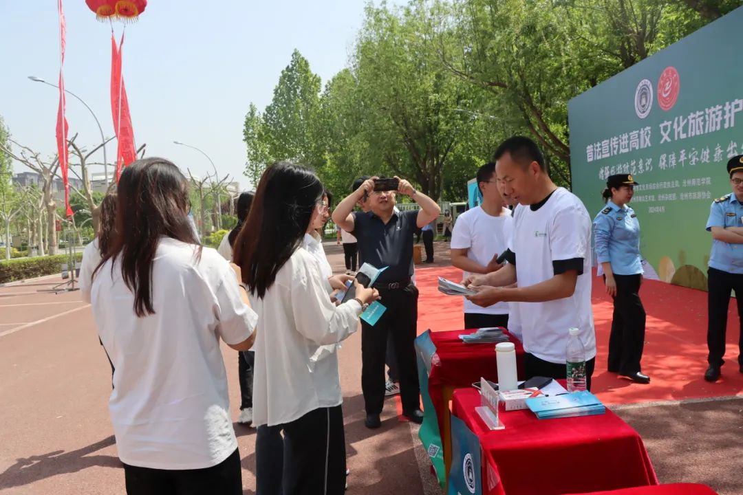 沧州市文化市场综合行政执法局工作人员现场设置了法律咨询台向同学们分发学习资料,并现场受理投诉举报。来自市旅游协会的工作人员对部分正规的旅行路线进行了介绍。
