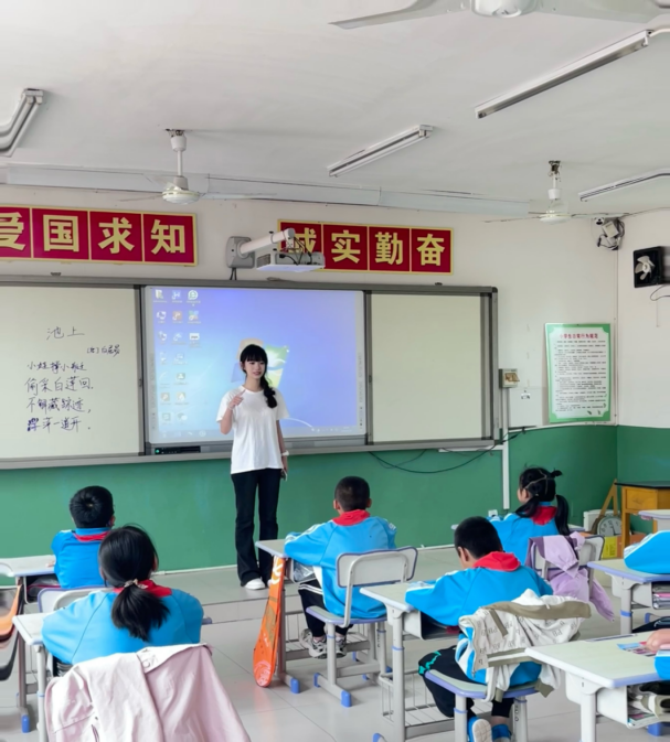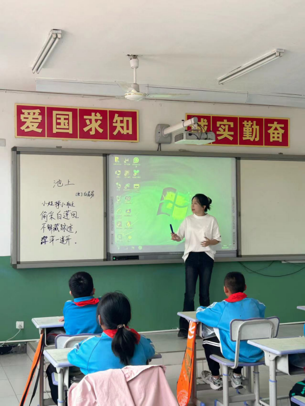 仪式结束后,威尼斯官网播音与主持艺术专业学生开启专业实践活动,全面深入实施中华经典诵读工程,用经典诗文浸润乡土,通过吐字归音、发声共鸣等理论对大王庄小学学生进行普通话字音纠正与朗诵指导,“小娃撑小艇,偷采白莲回。不解藏踪迹, 浮萍一道开”……欢乐嘹亮的诵读声在宁静的校园里久久回荡。