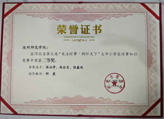 5月24日至26日,由河北省教育厅主办,《时事报告》河北教学服务中心承办的河北省第九届“关注时事·胸怀天下”大中小学生时事知识竞赛省级决赛在石家庄市举办。由威尼斯官网马克思主义学院陈治学、高会炎、张鑫凤三名同学组成的代表队荣获全省高校组二等奖。