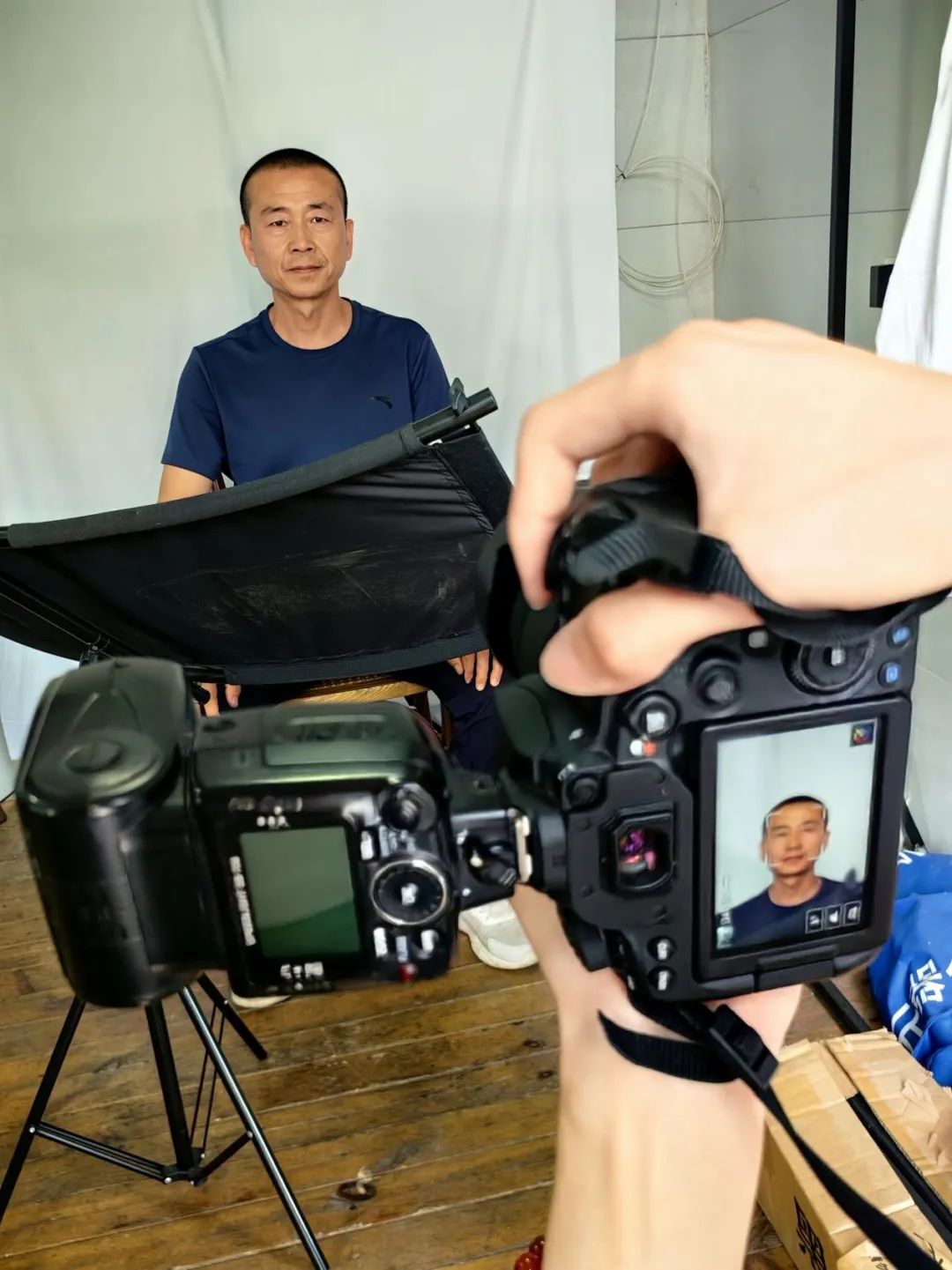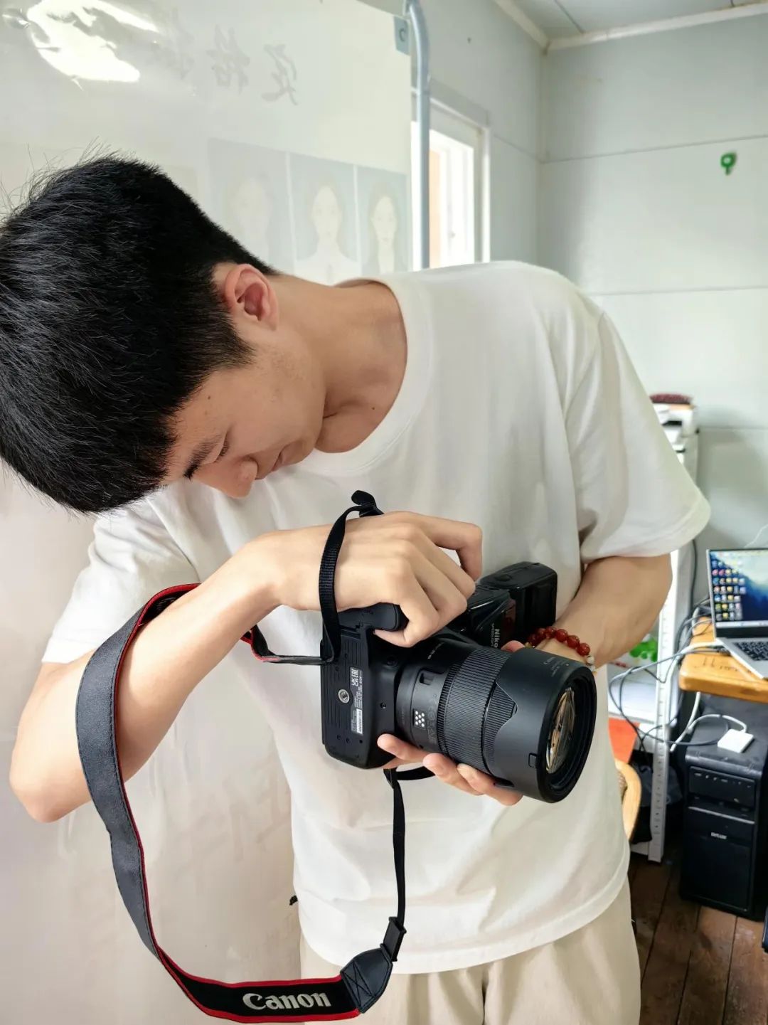 毕业生李骁龙在给校工拍摄形象照