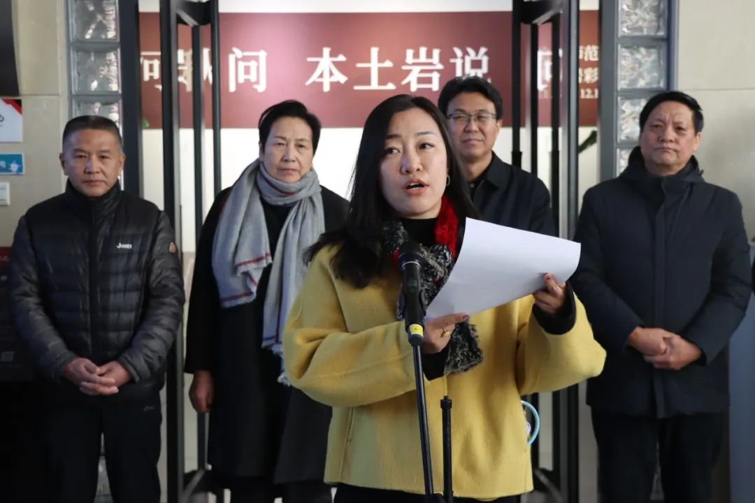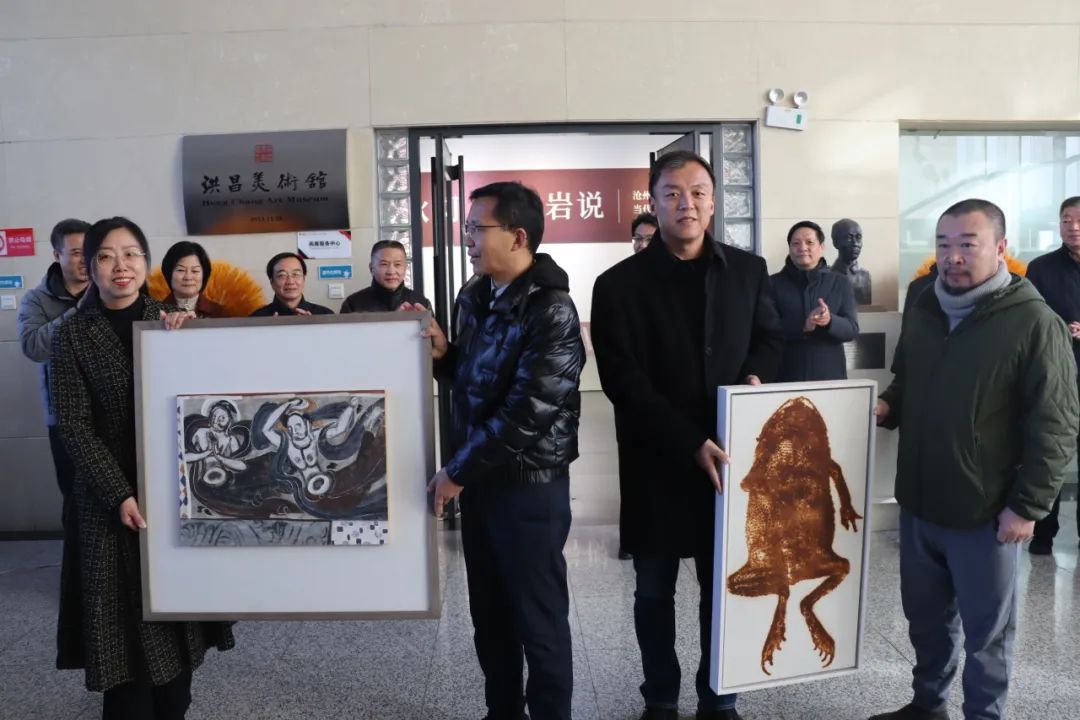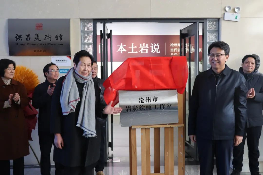 云电军宣布本次展览开幕,并与胡明哲一同为沧州市岩彩绘画工作室揭牌。