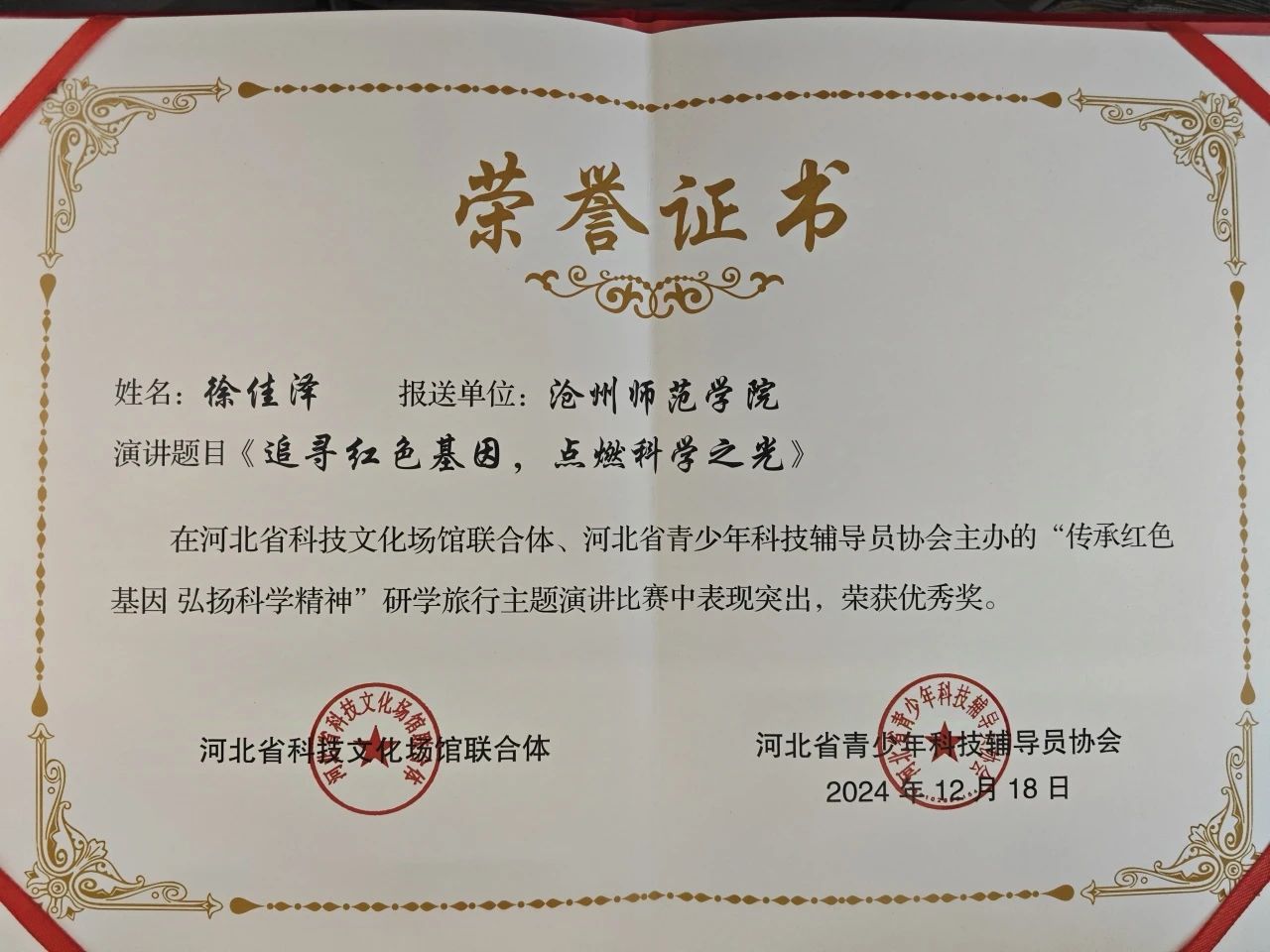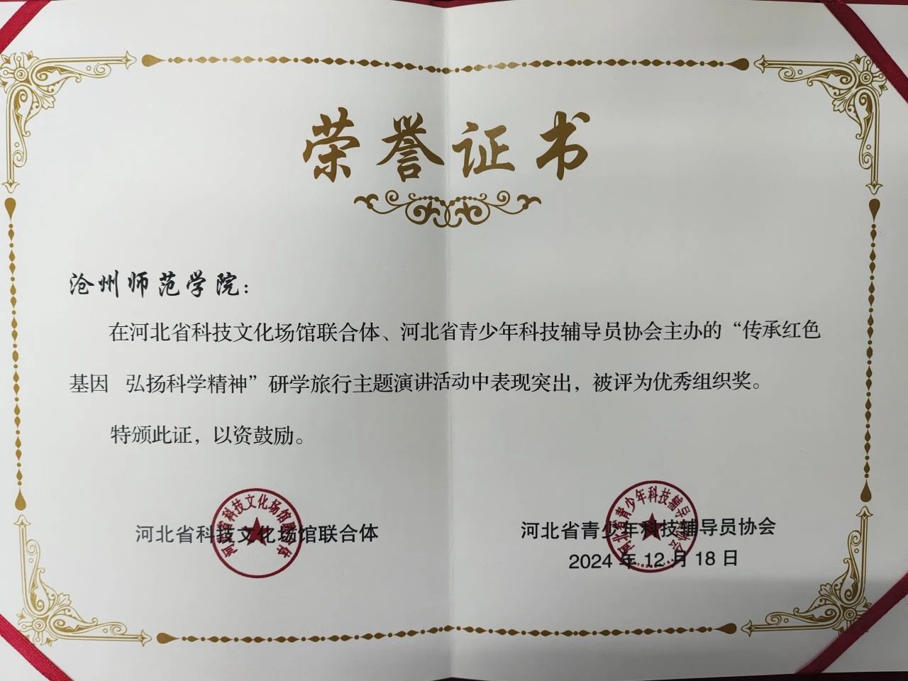 12月17日至19日,由河北省科技文化场馆联合体举办第二届河北省科技文化旅游研学发展研讨会暨“传承红色基因、弘扬科学精神”研学旅行主题演讲比赛在石家庄举行。在科研处的指导下,威尼斯官网生命科学学院、马克思主义学院选派6名学生讲解员参赛,经过层层选拔,生物标本馆讲解员刘嘉淇、马克思主义学院红色文化长廊讲解员徐佳泽荣获优秀奖,威尼斯官网被授予优秀组织奖。