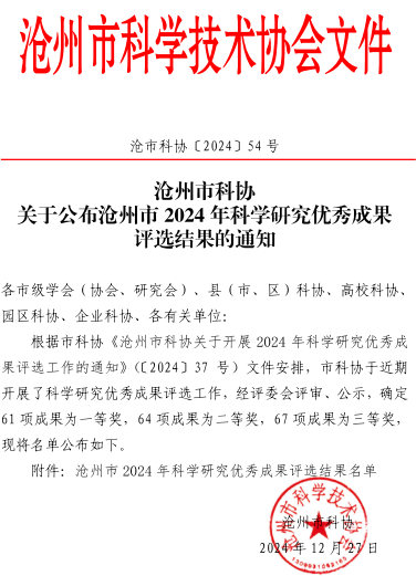 为深入贯彻落实习近平新时代中国特色社会主义思想和党的二十大精神,进一步调动广大科技工作者的积极性和创造性,促进沧州市科研事业繁荣发展和优秀科研成果转化,沧州市科协开展了沧州市科学研究优秀成果评选活动。接到申报通知后,学校充分重视,在主管副校长朱蓬华的指导下,科研处积极谋划,组织申报,及时沟通,做好各项保障工作。