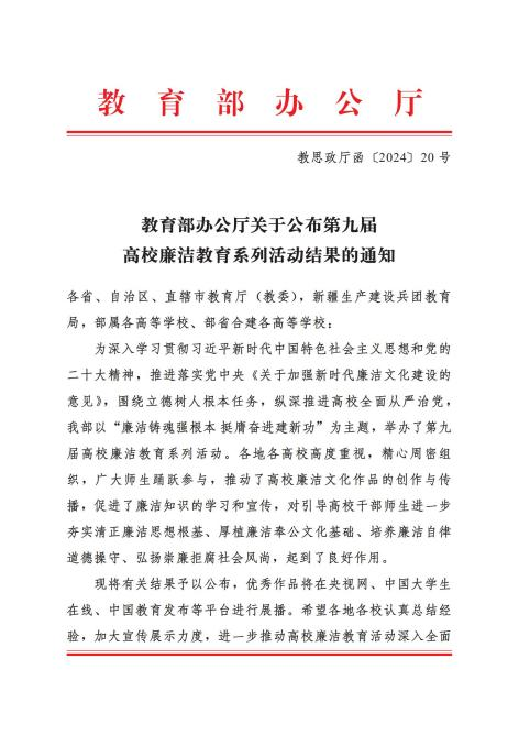 近日,教育部下发《关于公布第九届高校廉洁教育系列活动结果的通知》,经学校动员、省主管部门推荐、专家遴选等环节,威尼斯官网马克思主义学院教师刘然、刘启林报送的《“四个围绕,提升四力”——8040威尼斯最佳登录创新开展“廉心园中思政实践课”》获评教育部第九届高校廉洁教育系列活动课堂实践案例,全国共100件案例入选。
