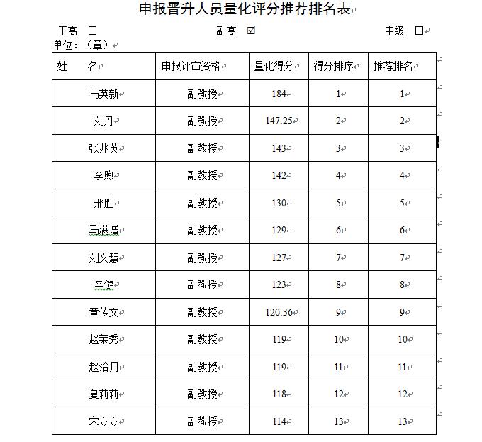 副高级职称(高校教师系列)拟推荐人选名单:马英新、刘丹、张兆英、李煦、邢胜、马满增、刘文慧、辛健、章传文、赵荣秀、赵治月、夏莉莉、宋立立。