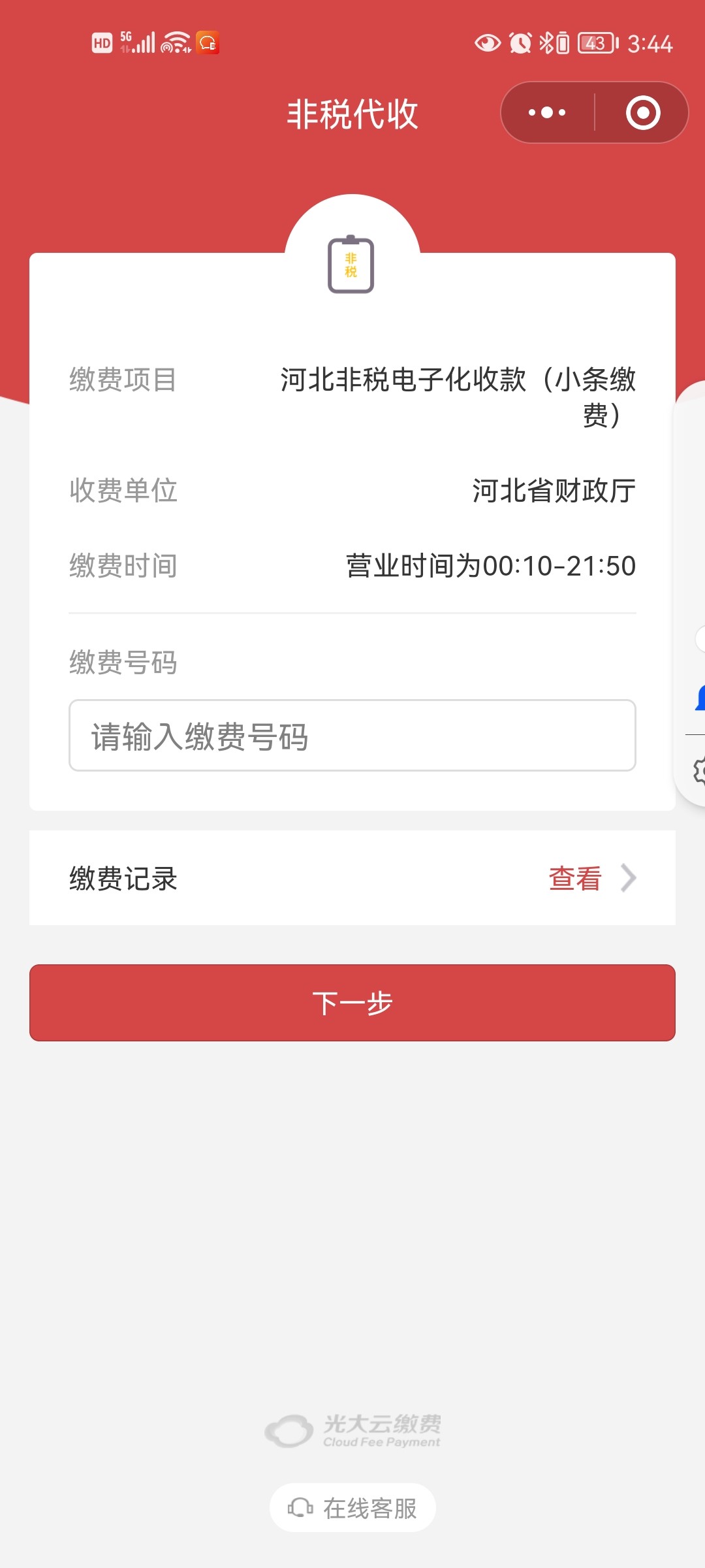 2、在缴费号码处输入“2024+身份证号”(例如:2024130903XXXXXXXXXXXX),点击下一步