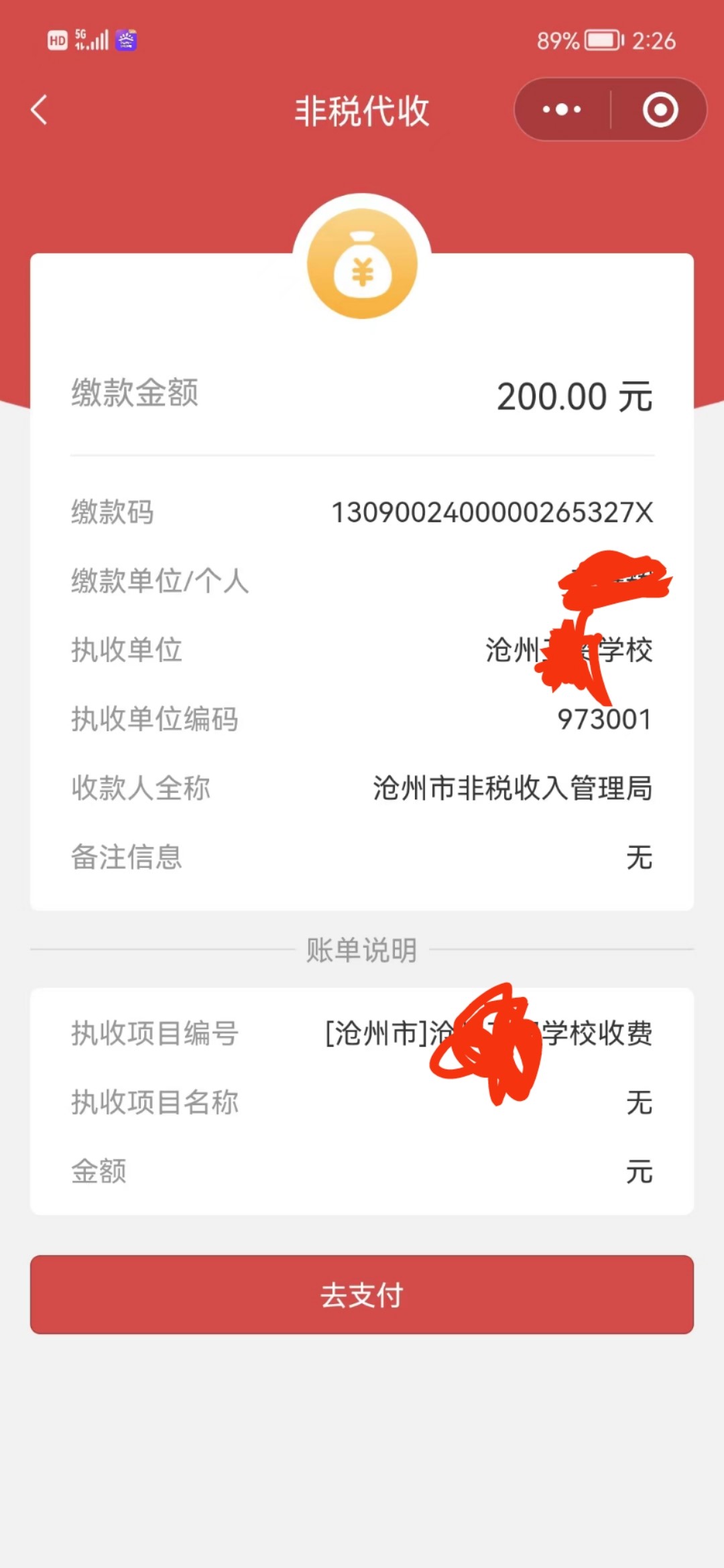 3、系统自动返显缴费信息,核对无误后点击去支付。