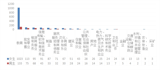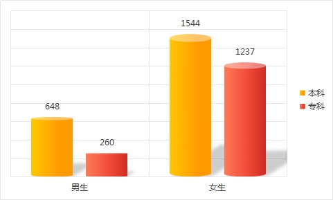2019届本科生2192中男生648人,占29.56%,女生1544人,占70.44%;专科生1497人中男生260人,占17.37%,女生1237人,占82.63%。
