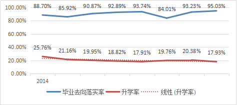 3-4-1威尼斯官网2014-2021年的总体毕业去向落实率、升学率变化趋势