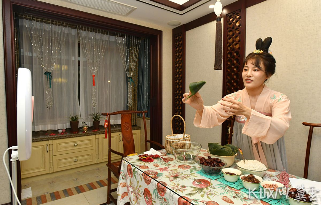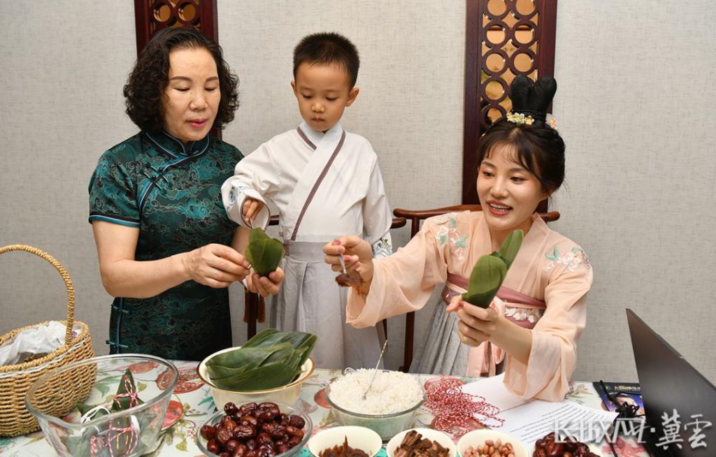 刘宣妤(右)在直播课上与家人一起为波黑、克罗地亚的学生演示包粽子。通讯员 苑立伟 摄