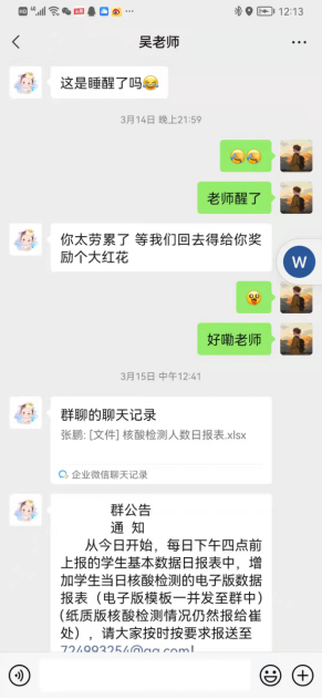 为了保证学校能够及时了解到在校生的情况,他时常和各年级辅导员联系,统计数据,整理表格,哪位同学今天外出宿舍了,哪位同学情绪又起伏了,是不是有同学发烧感冒了,核酸检测是否每位同学都做了,他曾经开玩笑的说:“我的眼睛长在同学们身上就好了!”