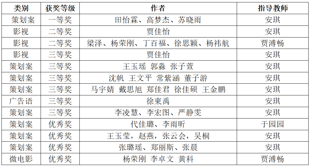 近日,第十三届全国大学生广告艺术大赛河北赛区比赛结果揭晓,齐越传媒学院学子共斩获13个奖项,包括省级一等奖1项,省级二等奖2项,省级三等奖6项,省级优秀奖4项。其中,在最能体现广告学子综合能力的策划案类项目中,齐越传媒学院学生获奖8项,省内成绩仅次于河北师范大学和河北大学。