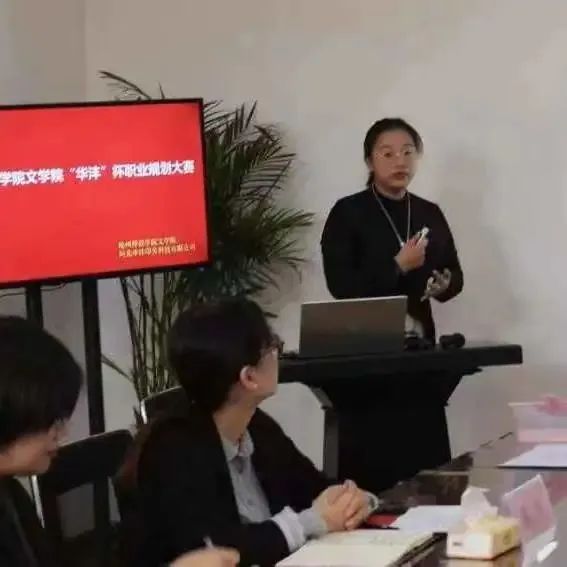 考察结束后,文学院在公司现场举办“华沣”杯职业规划大赛,为双方的合作拉开序幕。比赛由文学院副书记高雪莲主持,9名来自成长赛道和就业赛道的选手各显其能,将自己的职业目标、成长规划和行动成果进行了充分展示。展示环节后,王竹承与华沣公司人事经理王淑一对选手的表现给予精彩点评。