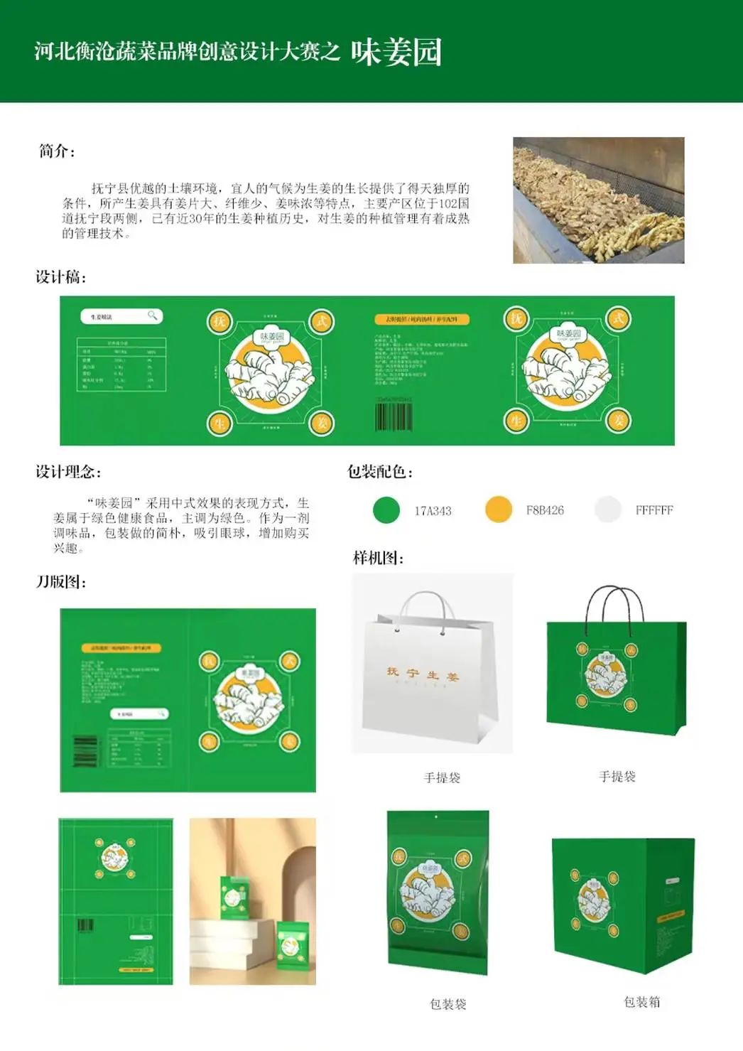介绍:抚宁县优越的土壤环境,宜人的气候为生姜的生长提供了得天独厚的条件。作为一剂不可缺少的调味品,本土种植的生姜占了优越的条件。“味姜园”的包装采用中式风格,产品属于绿色食品,所以主色调以绿色为主,突出主题“生姜”这个产品,鲜亮简明,一眼就能让消费者看到商品,更容易吸人眼球,引人注意。